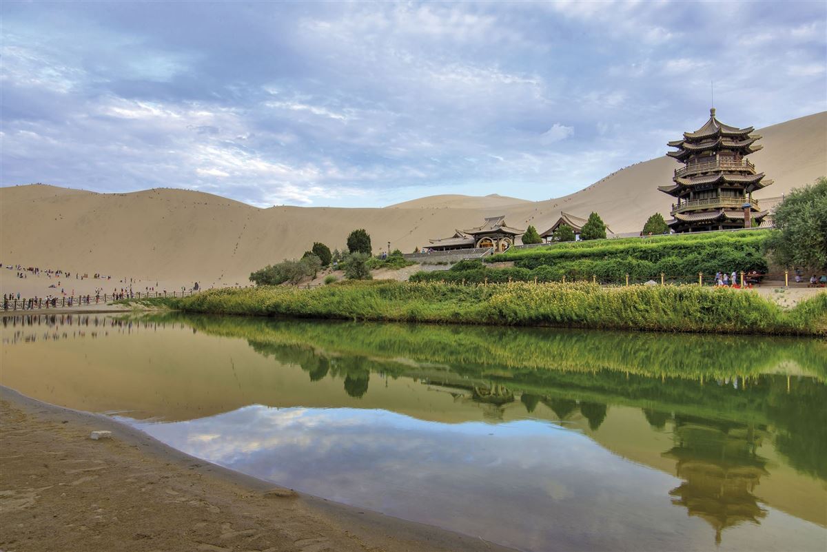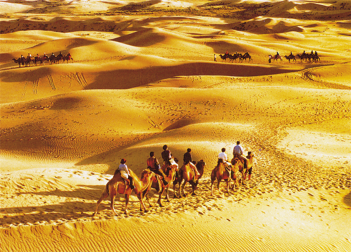 Morgens Fahrt mit dem Schnellzug nach Liuyuan, dem Bahnhof von Dunhuang (ca. 4h). Die Stadt gehört zur Provinz Gansu. Am Nachmittag besuchen wir die "singenden" Sanddünen im Randbereich der Wüste Gobi, und den einzigartigen Mondsichelsee, ein landschaftlicher Höhepunkte inmitten der Wüste, einer von Dünen umgebenen Oase. Am Abend genießen wir ein Essen in einem lokalen Restaurant, anschl. empfhielt sich ein individueller Rundgang über den Nachtmarkt.