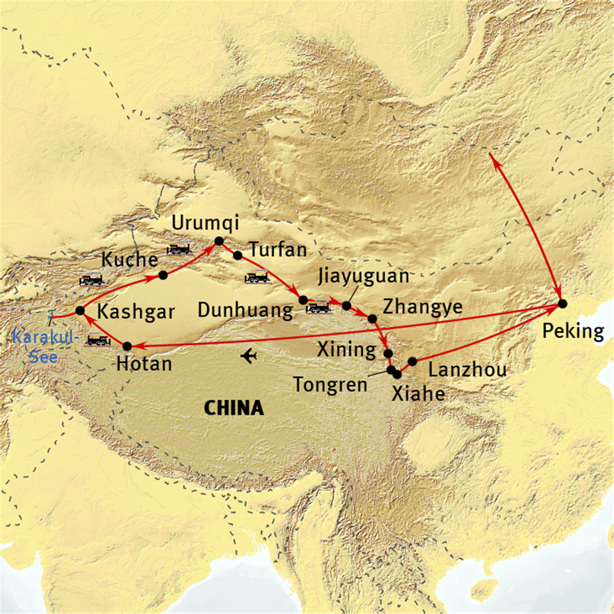 PekingHotanKashgarKuqaUrumqiTurpanDunhuangJiayuguanZhangyeXiningXiaheLanzhou