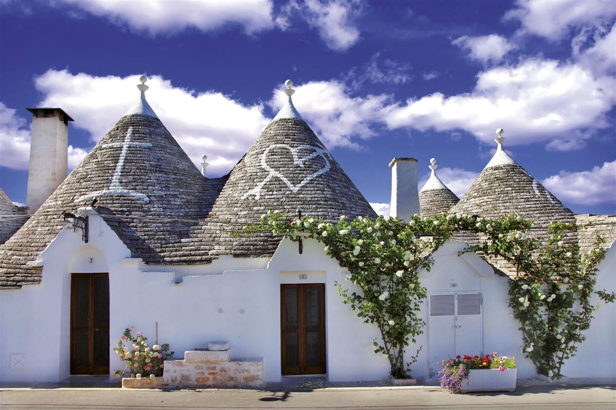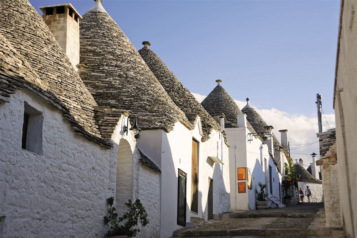 Am Vormittag fahren wir nach Ostuni. Diese weiße Stadt erhebt sich wie ein Adlernest über der Küste. Bei einem Rundgang durch das malerische Labyrinth der Gassen und Treppen besichtigen wir die Kathedrale aus dem 14. Jahrhundert mit einer großen Fensterrose an der Fassade. Mittags besuchen wir eine Bauerngenossenschaft, die sich auf die Herstellung lokaler Käsesorten spezialisiert hat. Leichtes Mittagessen mit Wein und Wasser. Weiterfahrt zu einer Olivenölmühle, wo uns der Prozess der Olivenölherstellung erklärt wird, gefolgt von einer Verkostung einiger Öle. Am Nachmittag geht es vorbei an Steinmauern und zahlreichen Olivenhainen ins Itria-Tal nach Alberobello, der Hauptstadt der Trulli. Diese runden Bauten mit kegelförmigen Dächern sind ein beliebtes Fotomotiv. Wir besuchen diesen wunderschönen Ort und lassen uns von dieser märchenhaften Landschaft verführen., bevor wir unser zweites Hotel der Reise beziehen. Übernachtung und Abendessen im Hotel in Alberobello.