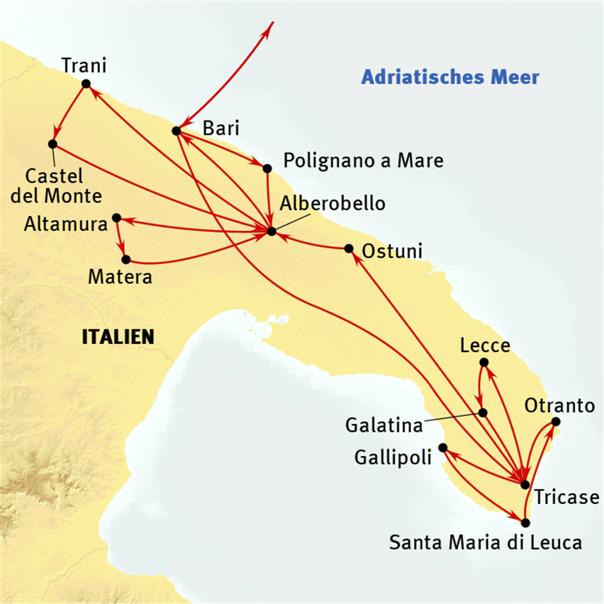 Apulien, das Land der Trulli, Kastelle und kulinarischen Genüsse, vereint Natur, Geschichte und Tradition auf einzigartige Weise. Zwischen weißen Dörfern, alten Olivenhainen und dem türkisblauen Meer erwarten uns kulturelle Highlights wie Alberobello, Lecce und das Castel del Monte. Die apulische Küche mit Orecchiette, frischem Fisch und regionalem Wein rundet das Erlebnis perfekt ab.