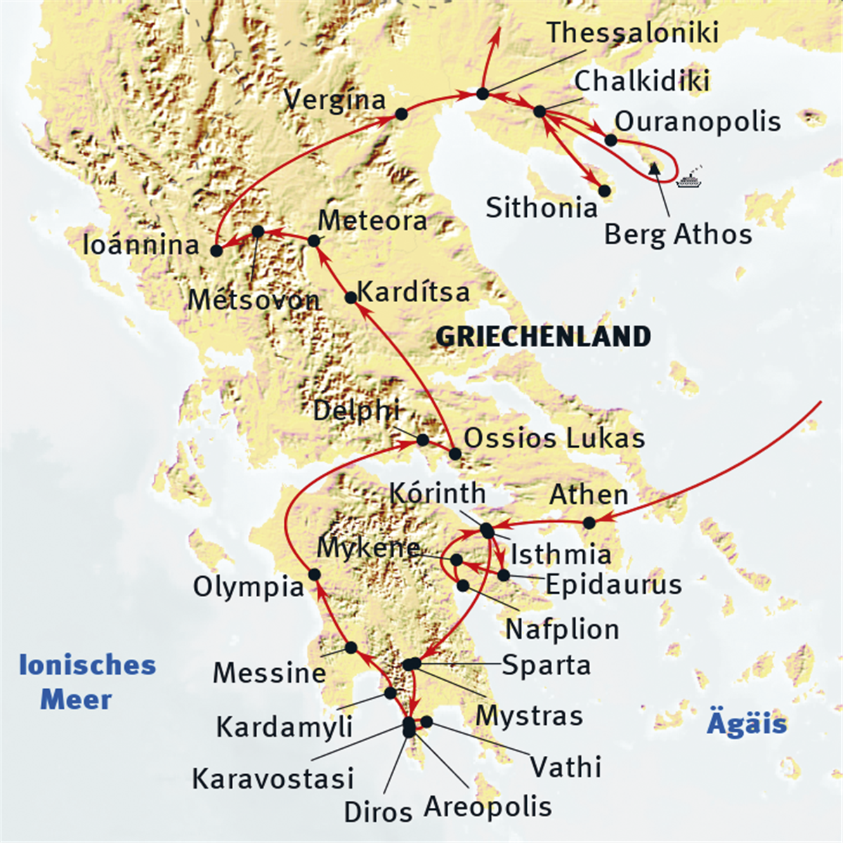 Nach dem Frühstück fahren wir entlang der Ausläufer des Holomondas Gebirges nach Ouranoupolis, auf dem dritten Finger der Halbinsel Chalkidiki gelegen. Hier beginnt unsere ca. 3- stündige Bootsfahrt im Golf von Agion Oros. Wir sehen die einzige Klosterrepublik Europas – Athos, die vor über tausend Jahren gegründet wurde und wo seither jedem weiblichen Wesen der Zutritt verboten ist. Wir erleben den Zauber dieser einzigartigen Landschaft und haben einen prächtigen Blick auf die Klöster um den Berg Athos herum, wo heute noch ca 1.700 Mönche leben. Am Nachmittag Rückfahrt zum Hotel. Unterwegs halten wir in Stageira, dem Geburtsort des Aristoteles, und in dem traditionellen Bergdorf Arnaia. Imkerbesuch. (Tagesdistanz ca. 230 km).