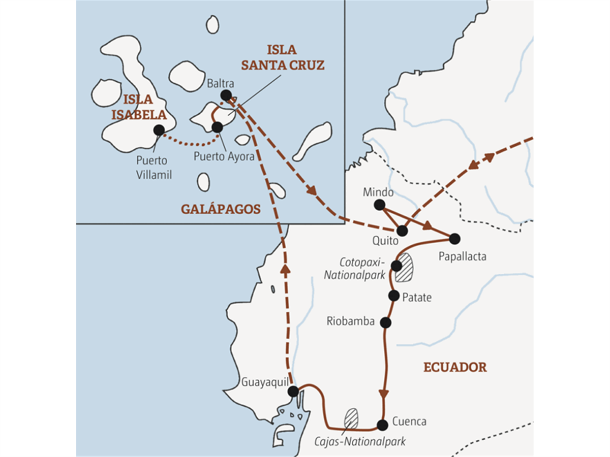Bei Buchung des Langstreckenfluges mit Iberia Flug von Baltra nach Quito und abends Weiterflug nach Madrid. Alternativ fliegen Sie von Baltra nach Guayaquil und von dort am Abend mit KLM nach Amsterdam.