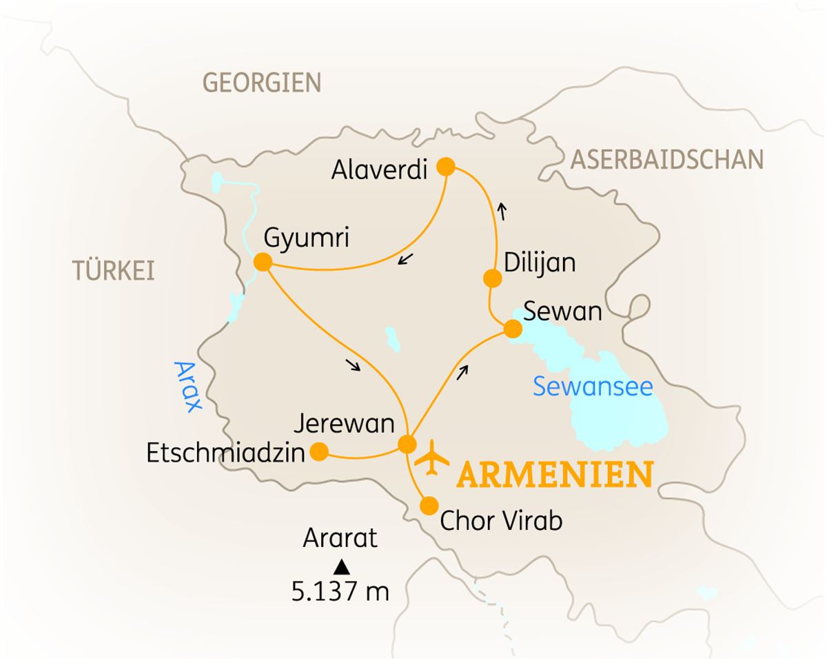 Bewundern Sie auf Ihrem Weg das malerische Dorf Dsegh, wo sich viele Fotogelegenheiten in der beeindruckenden Natur bieten. Nach der Besichtigung fahren Sie nach Gjumri und lernen bei einer Stadtrundfahrt die bedeutendsten Sehenswürdigkeiten der zweitgrößten Stadt Armeniens kennen. Freuen Sie sich auf typische Köstlichkeiten in einem Fischrestaurant. Anschließend reisen Sie auf der legendären Seidenstraße zurück nach Jerewan und lassen sich von der Ruine der St. Gregor-Kathedrale (7. Jh.), den bemerkenswerten Überresten des Königlichen Palastes (7. Jh.) sowie von der alten Karawanserei (13. Jh.) in frühere Zeiten versetzen. 4 Nächte in Jerewan. (F/M)