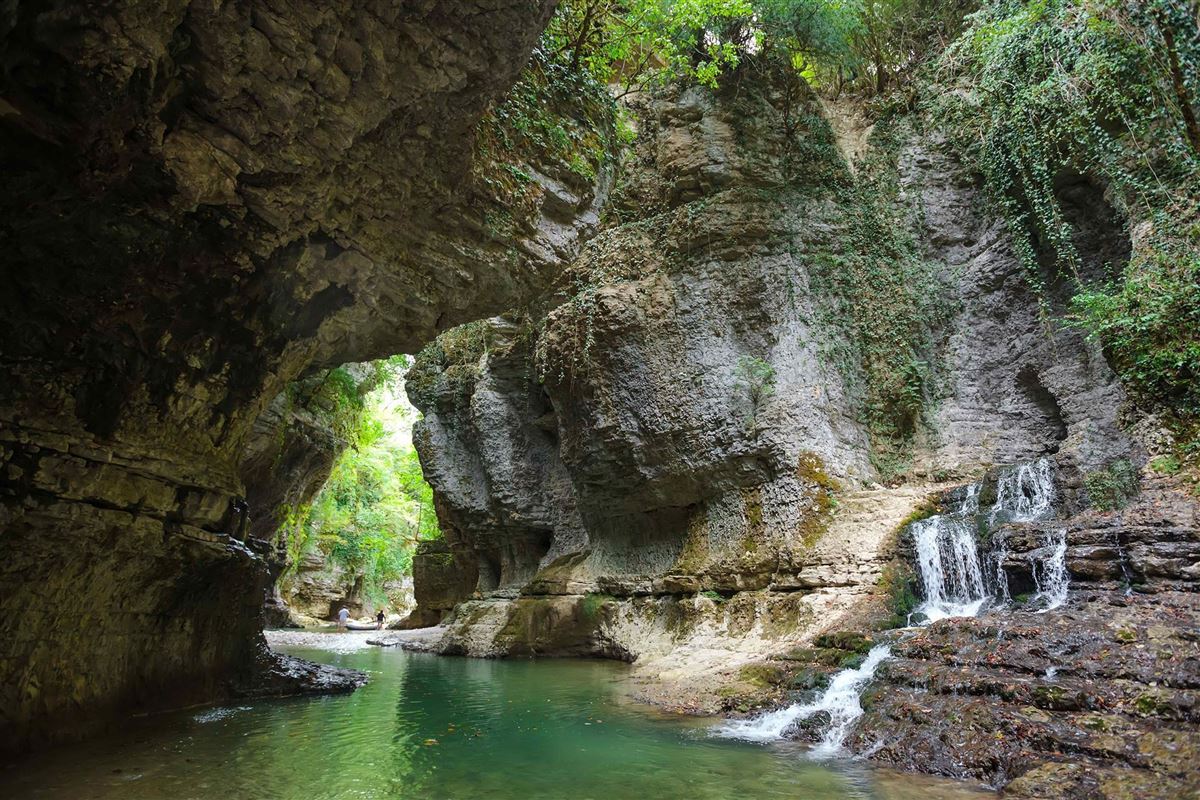 Heute besuchen Sie eines der schönsten Naturwunder Georgiens: die Martvili-Schlucht. Durch den 20 bis 40 Meter tiefen Canyon fließt das türkisblaue Wasser des Abasha-Flusses. Sie erkunden dieses felsig-verwunschene Naturschutzgebiet mit dem Boot und entdecken Höhlen, Kaskaden und einen zwölf Meter hohen Wasserfall. Freuen Sie sich im Anschluss auf die nahegelegene Prometheus-Höhle. Bei einer Führung erfahren Sie mehr über die unterirdischen Felsformationen, Stalagtiten und Stalagmiten. Mittags kehren Sie zu Mittag und köstlichem Wein in eine Gaststätte ein. (F/M)