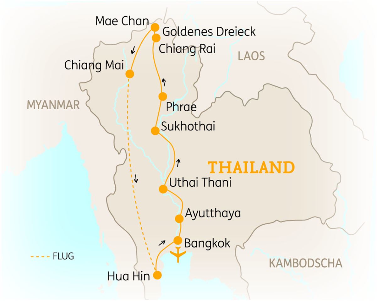 Sie verlassen Bangkok und schon steht ein weiterer Höhepunkt Ihrer Reise an! Besichtigen Sie die eindrucksvolle Tempelanlage von Ayutthaya (UNESCO Weltkulturerbe), ein Freilichtmuseum buddhistischer Hochkultur. Vom früheren Glanz zeugen auch heute noch viele Tempel, Klöster, Paläste und Monumentalskulpturen. Durch üppige Landschaften erreichen Sie im Anschluss ein lokales Dorf und erhalten hier einen Einblick in den Herstellungsprozess verschiedenster Arten von Trommeln sowie natürlicher Kosmetikprodukte. Ihr heutiges Tagesziel ist die Stadt Uthai Thani, die etwas abseits der Hauptverkehrsroute zwischen Bangkok und Chiang Mai liegt. Hier besichtigen Sie den wohl schönsten Tempel des Landes, den atemberaubenden Kristall-Tempel Wat Tha Sung sowie auch den beeindruckenden Goldenen Tempel. Nutzen Sie nach dem Check In in Ihrem Hotel die Möglichkeit, in einer kleinen Unterrichtsstunde ein paar Worte auf Thai zu lernen, die Sie mit Sicherheit während Ihrer Reise noch nutzen können. 1 Nacht in Uthai Thani. (F)