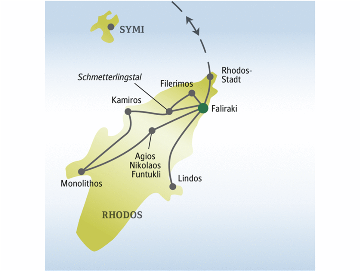 Ein Tag für Leib und Seele! Geistige Erbauung holen wir uns im Kloster Filerimos mit seiner erhabenen Atmosphäre. Rundum duftet es nach Zypressen und Kiefern, und wenn es klar ist, blicken wir auf die ägäische Inselwelt bis hin zur türkischen Küste. Darauf gibt Ihr Reiseleiter ein Glas vom klostereigenen Kräuterlikör aus! Gut, dass die anschließende • Wanderung (1 Std., leicht, ?250 m ?250 m) so entspannt ist, dass wir nicht einmal Wanderschuhe brauchen. Über Stege, Treppen und Brücken schweben wir leichten Fußes durchs grüne Schmetterlingstal mit seinen knorrigen Bäumen und romantischen Wasserfällen bis zum Kloster Panagia Kalopetra mit wunderbarem Fernblick. Im Anschluss lockt ein Weingut mit edlen Tropfen: Ob Athiri und Mandilaria so genussreich schmecken, wie die klangvollen Namen vermuten lassen? Die Winzerin lässt uns kosten, was die neuen Anbaumethoden und Traubensorten der Insel hergeben, und lädt uns zum Mittagessen ein. Auf der Terrasse erwarten uns zum Abschluss der Reise kulinarische Spezialitäten von Rhodos – mit Blick auf die umliegenden Weinberge. 50 km. Auch den heutigen Nachmittag können Sie noch ein letztes Mal nach Lust und Laune für Strand, Meer, Baden und süßes Nichtstun nutzen. Oder noch mal zum Bummeln nach Rhodos-Stadt?