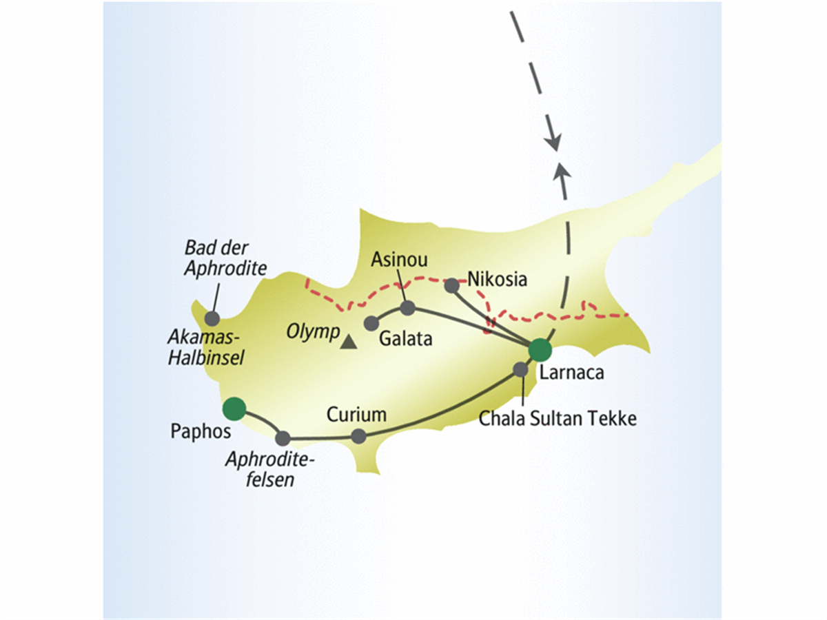 Aphrodite stieg sicher nicht zufällig gerade in Zypern aus dem Meer – die Göttin der Liebe wusste schließlich, wo es schön ist! Antike Säulen, weiße Bergdörfer und Palmenpromenaden am Mittelmeer sorgen für reichlich Abwechslung während Ihrer Inselwoche. Und im Norden der geteilten Hauptstadt Nikosia inszeniert sich der Orient mit Muezzinrufen, Minaretten und türkischem Mokka. Natürlich bleibt Zeit zum Baden in unseren beiden Strandhotels. Sie tauchen aber auch beim Käsemachen mit Petros ins Dorfleben ein, mit Stelios bei Larnaca in die Künstlerszene. Und egal ob beim Picknick mit Bergblick oder beim Bar-Hopping in Paphos – gemeinsam macht die drittgrößte Mittelmeerinsel besonders viel Spaß!