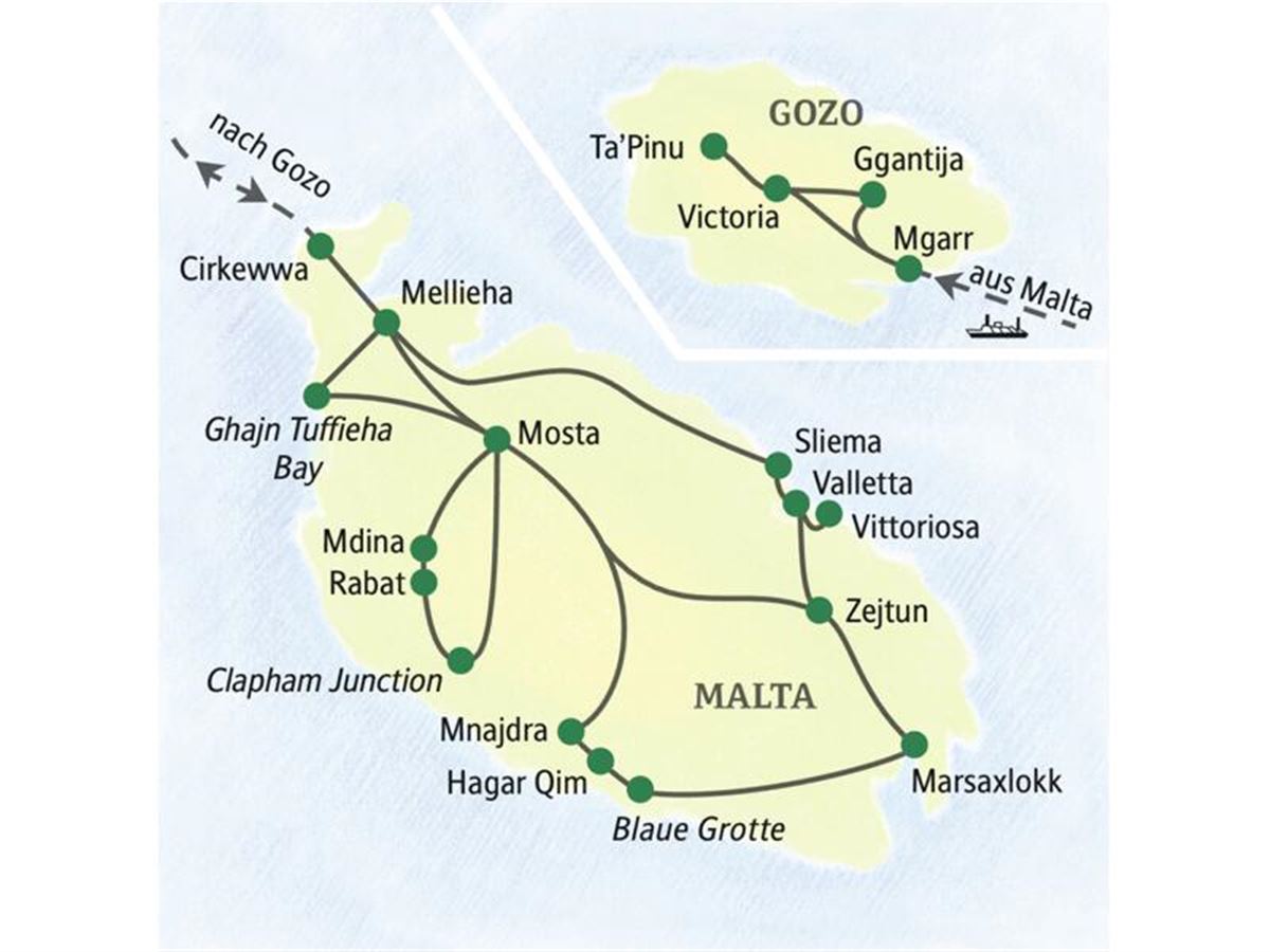 Eine leichte Brise weht vom Mittelmeer, wir blicken von den Steinzeittempeln Hagar Qim und Mnajdra (beides UNESCO-Welterbe) über die Klippen bis zum Horizont. Dann lassen uns eigentümliche Funde in der Karsthöhle Ghar Dalam rätseln. Im Fischerort Marsaxlokk zwinkern uns mittags die traditionellen Boote zu. Wo Sie den leckersten Fisch auf den Teller bekommen? Tipps hat Ihr Reiseleiter. Später greifen wir dann in Zejtun zur Kugel: Mitglieder des Bocciaclubs weihen uns in die Geheimnisse des maltesischen Volkssports ein und ermuntern zum fröhlichen Wettkampf. Wie geht eigentlich der EU-Außenposten Malta mit der nunmehr seit Jahren andauernden Flüchtlingsproblematik um? Ein Thema auf dem Rückweg. 60 km.