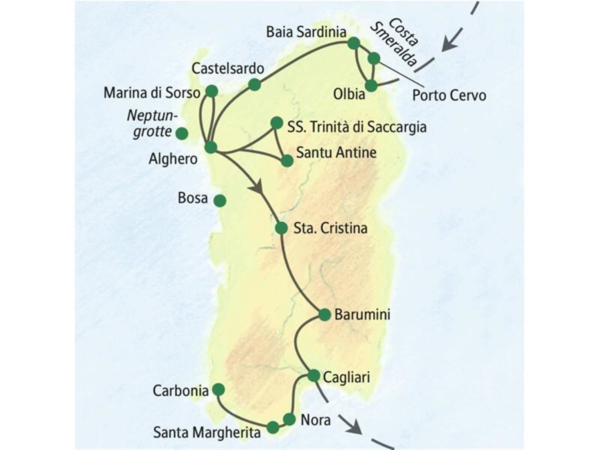 Heute noch mal ins brodelnde Leben: Sardiniens Hauptstadt Cagliari, zwischen Kalkfelsen und Salzseen gelegen, vom Kastell gekrönt, von der Hafenpromenade Via Roma gerahmt. Was für ein Stadtbild! Durchs Elefantentor geht's zum Dom und zum archäologischen Museum: Hier erzählen uns die Bronzetti, die berühmten Bronzestatuetten, wie das Leben auf der Insel vor etwa 3000 Jahren war. Nachmittags bleibt Zeit, sich noch in aller Ruhe umzusehen und Souvenirs zu erstehen. 90 km. Beim Abschiedsessen im Hotel ist eines gewiss: Der Duft des Meeres, der Macchia und des Mirtos werden als weitere sinnliche Erinnerung mit nach Hause reisen.