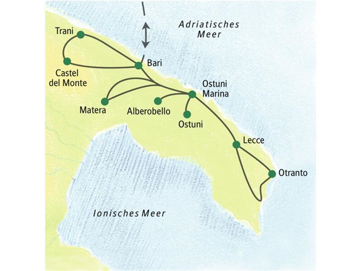 Wir bringen Sie im Laufe des Tages zum Flughafen von Bari bzw. bei entsprechender Buchung zum Flughafen von Brindisi. Individueller Rückflug zu den Ausgangsorten.