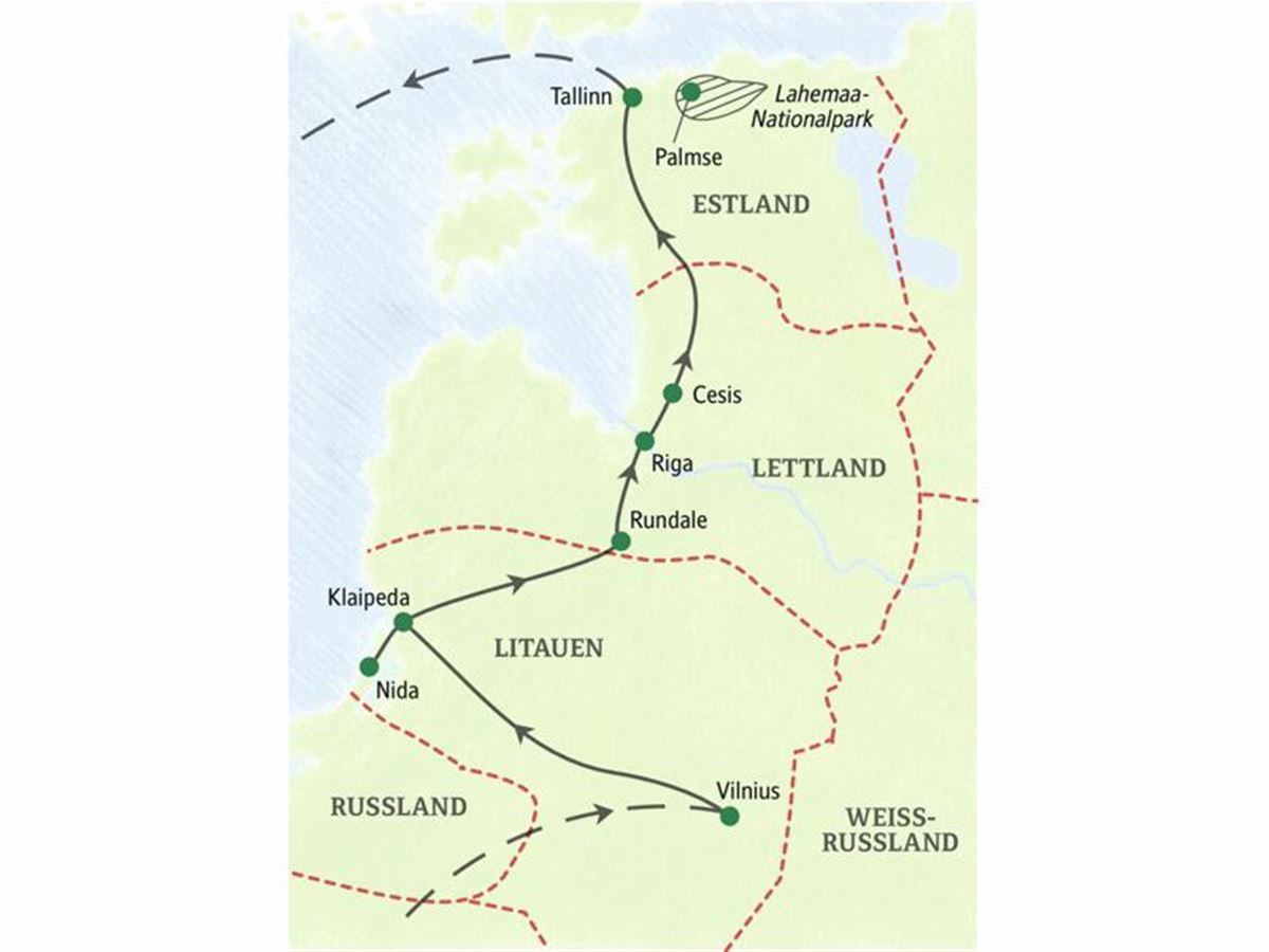 Adieu, Litauen! Lettland empfängt uns mit offenen Armen und seinem schönsten Kleinod: Durch unberührte Natur fahren wir zum barocken Schloss Rundale, dem Versailles des Baltikums. Dabei wurde der Herzog von Kurland eher von der Petersburger Eremitage inspiriert und warb deren Architekten Rastrelli an, um seine Sommerresidenz zu entwerfen. Später begrüßt uns Riga, wo wir unser grünes Wunder erleben: Die lettische Hauptstadt ist ein Gartenparadies. Beim Spaziergang durch die Altstadt (UNESCO-Welterbe) verschaffen wir uns einen ersten Eindruck. Der Flair der alten Hansestadt begegnet uns auf vielen Plätzen und in den Gassen. Mehr Rot zum Abendessen? Probieren Sie Auksta Zupa, die traditionelle Rote-Bete-Suppe. Wo Sie die beste finden, verrät Ihr Reiseleiter. Zwei Übernachtungen in Riga. 330 km.
