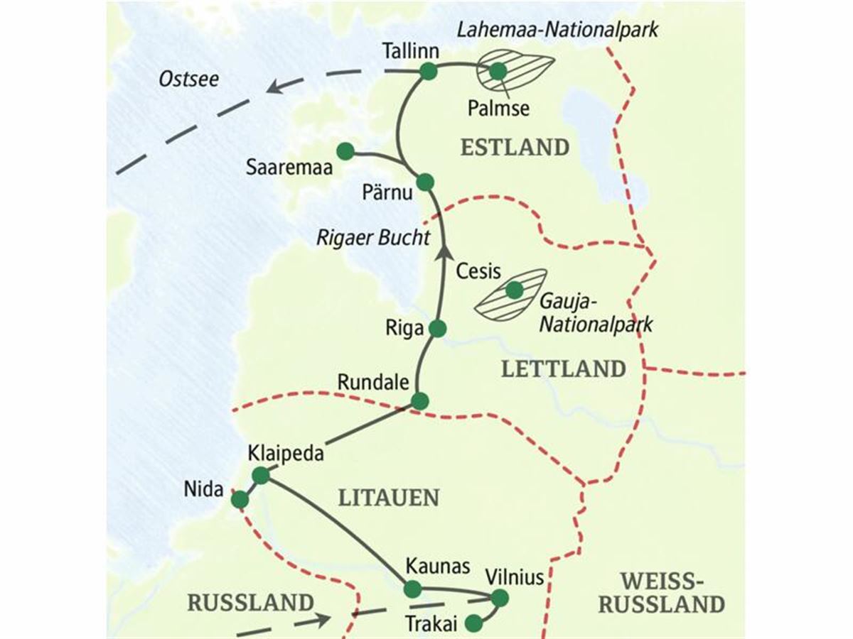 Ein kurzer Stopp vor dem Grenzübertritt am Berg der Kreuze in der Nähe von Siauliai, bevor es "Adieu, Litauen, hallo, Lettland" heißt: Sprache, Kultur - alles neu. Das Barockschloss Rundale verkörpert italienischen Chic: Architekt Rastrelli, Schöpfer der Petersburger Eremitage, entwarf die Sommerresidenz für den kurländischen Herzog Biron. Schon beim Überqueren des Flusses Daugava erahnen wir die Schönheit des historischen Zentrums von Riga (UNESCO-Welterbe). 400 km. Drei Übernachtungen in Riga.