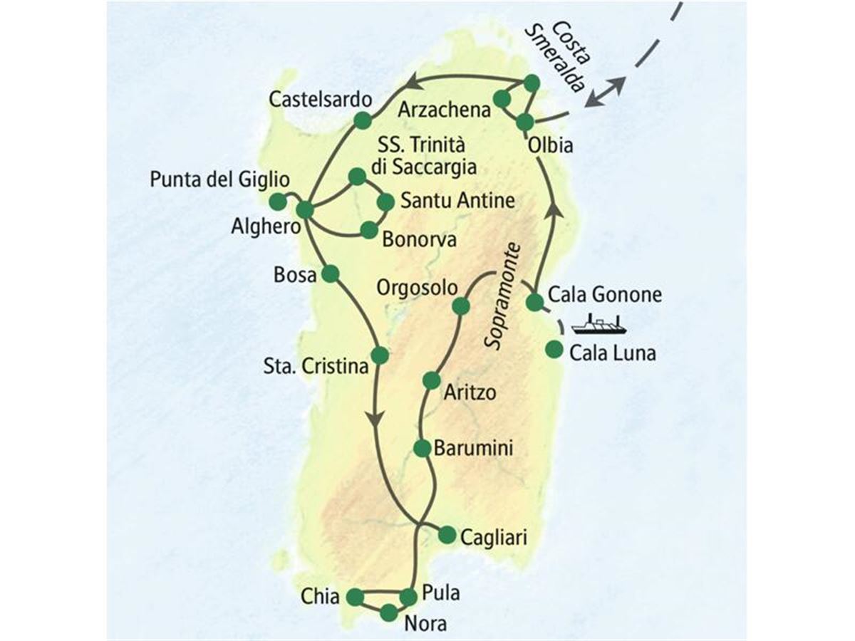 In Alghero kommt uns vieles spanisch vor: kopfsteingepflasterte Altstadt mit dicken Stadtmauern, italienisch-katalanische Straßenschilder. Warum? Ihr Reiseleiter weiß die Antwort! Wir schauen uns den Stilmix der Kirche S. Francesco genauer an, und es bleibt auch Zeit für einen Einkaufsbummel oder einen Spaziergang auf dem Stadtwall. Mit Sicht auf Yachthafen und Meer schmeckt ein Glas kühler Vermentino hier besonders gut. An der Steilküste wandern wir (3 Std., leicht, ↑↓ 100 m) mit herrlichem Blick auf Alghero und das Capo Caccia nachmittags zur Punta del Giglio. Fahrtstrecke 60 km.