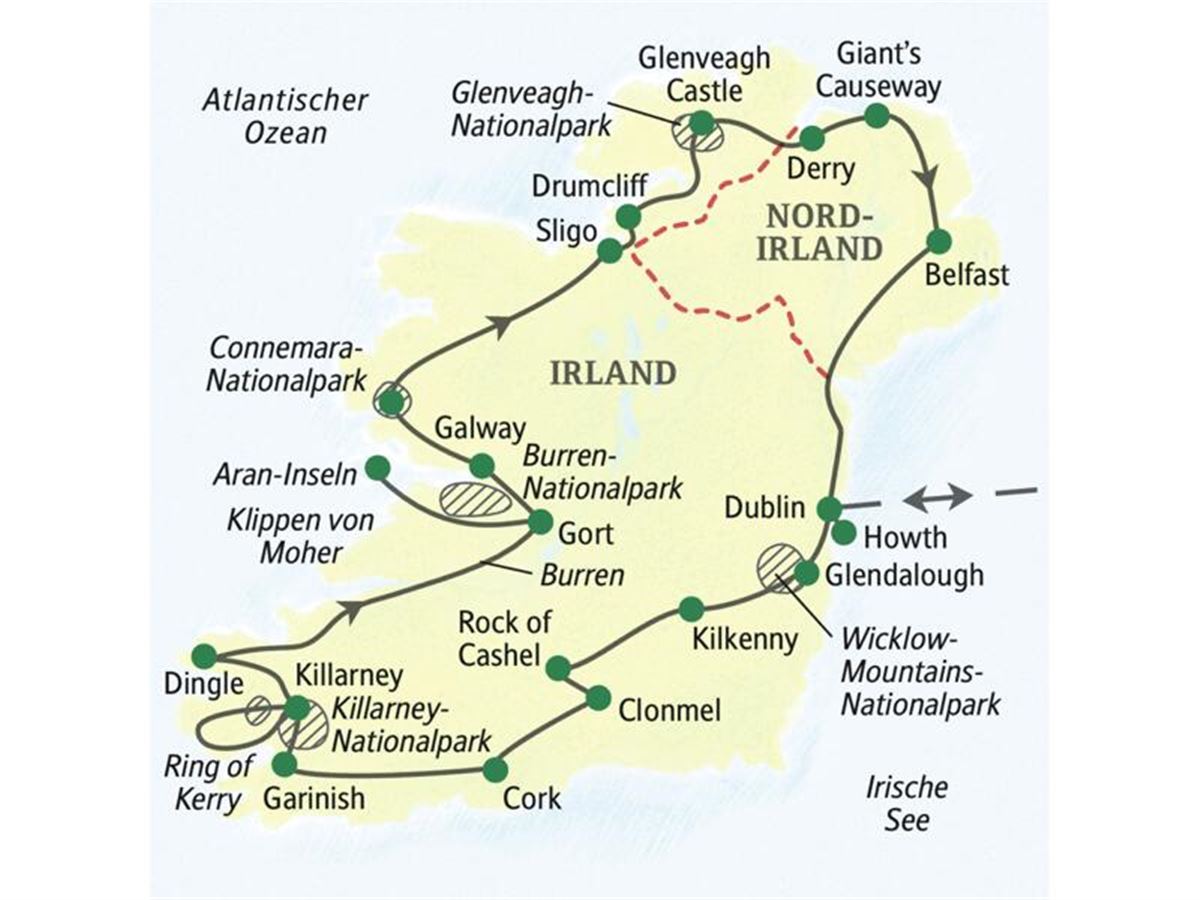 Vielleicht weckt Sie ja heute der Gesang der Amseln, der Lieblinge des heiligen Kevin. Den Spuren des eigenwilligen Heiligen, der hier in klösterlicher Einsamkeit steinalt wurde, folgen wir auf unserer Wanderung (2,5 Std., leicht, ↑↓ 200 m) durch den Nationalpark Wicklow Mountains. Unterwegs prosten wir uns mit irischem "Lebenswasser" zu – auf ein langes Leben! Für viele die Schönste im Land: die Mittelalterperle Kilkenny, wo mittags Zeit für eine Stadtrunde bleibt. Am Nachmittag erobern wir die "irische Akropolis", den Rock of Cashel, auf dem Feen und Geister, keltische Könige und christliche Bischöfe regierten. Übernachtung in Clonmel. 210 km.