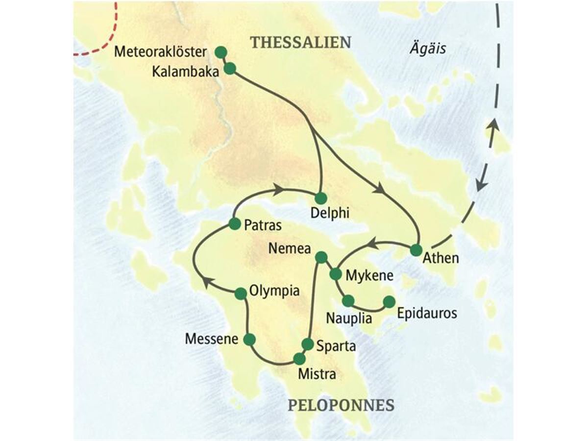 Wie eine Fata Morgana erscheinen die Meteoraklöster (UNESCO-Welterbe) hoch oben auf den aufragenden Felskuppen. Zwei der Klöster nehmen wir genau unter die Lupe, beleuchten die schillernde Freskenmalerei und die Geheimnisse orthodoxer Religiosität. Zu den bestgehüteten Geheimnissen gehören bekanntlich Lieblingsplätze – doch Ihre Reiseleiterin teilt Ihnen den ihren mit Blick auf diese atemberaubende Landschaft. Während dieser Moment nachhallt, schmeicheln sich noch einmal griechische Klänge in Ihr Ohr: Musikvielfalt von Mikis Theodorakis bis Anna Vissi begleitet unsere Fahrt zurück nach Athen. 350 km. Wenn die Stadt zu leuchten beginnt, spazieren wir durch die romantischen Gassen der Plaka zum Abschiedsessen in eine urige Taverne. Und Ihre Reiseleiterin toppt die gesellige Runde mit einem würzigen Abschiedsgeschenk, es muss ja nicht immer griechischer Wein sein ...