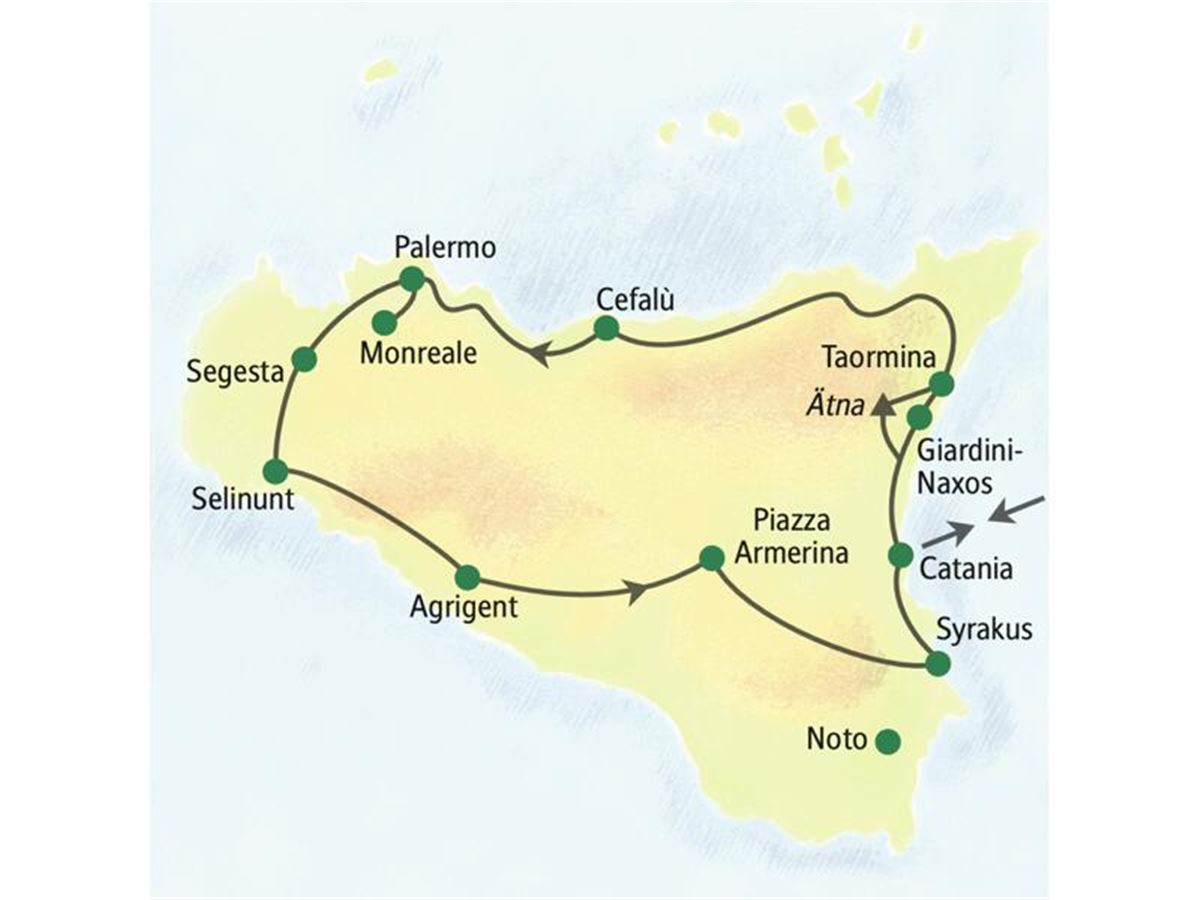 Bahnanreise 1. Klasse zum Flughafen und Flug nach Catania. Ein Mitarbeiter unserer Agentur empfängt Sie am Flughafen und sorgt für den Transfer in den Badeort Giardini-Naxos bei Taormina. 60 km. Wenn Ihre Ankunftszeit es zulässt, können Sie schon mal die Meeresluft bei einem Strandspaziergang genießen. Beim Abendessen lernen Sie die Gruppe und Ihren Studiosus-Reiseleiter kennen. Drei Übernachtungen in einem Hotel in Giardini-Naxos.