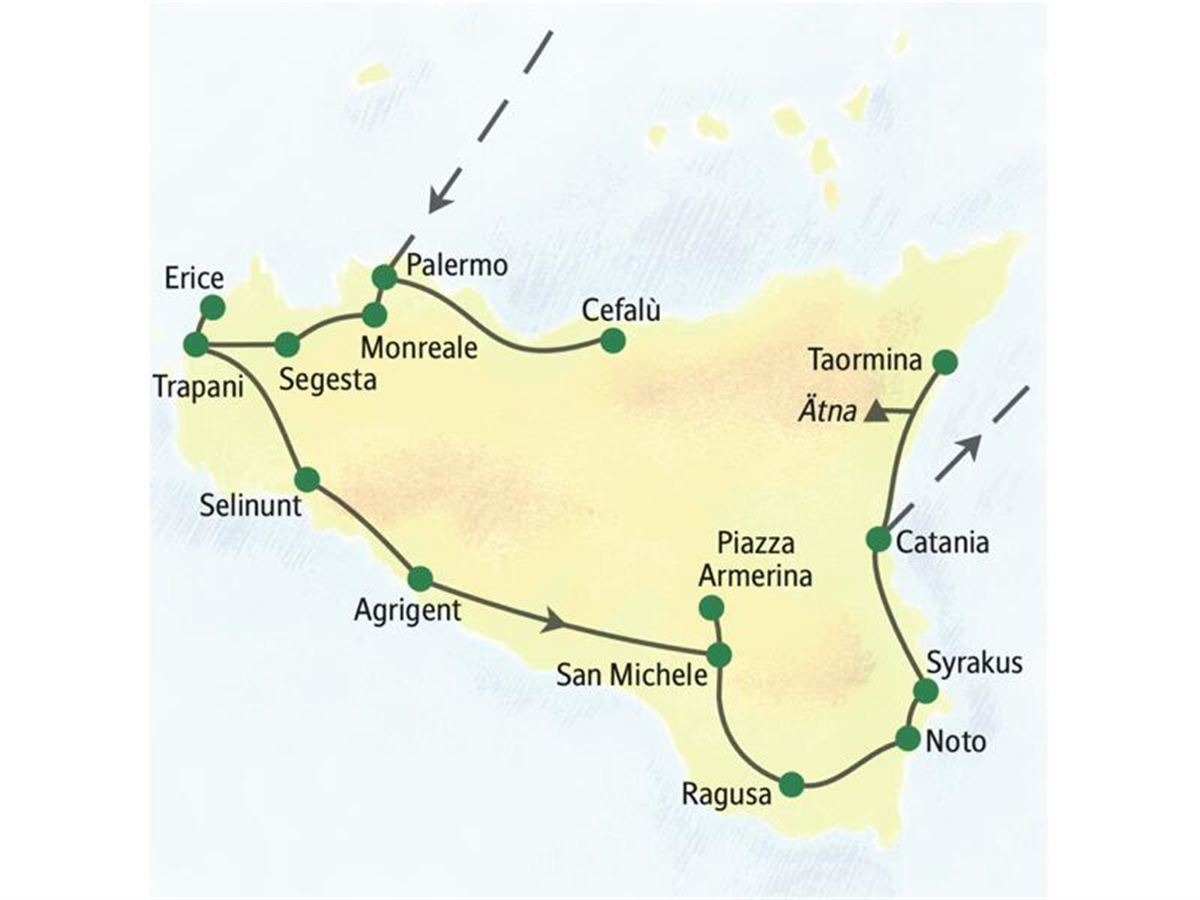 Schneeweiß schiebt sich Trapani auf einer Landzunge ins Meer – mit einer Prise Arabien im Stadtbild. Nach dem Stadtspaziergang glitzern vor fotogener Windmühlenkulisse die Salzberge der Saline – Naturreservat und Wirtschaftsgrundlage der Region. Von der mühsamen Arbeit in den Salzpfannen und dem Zauber der Salzblumen erzählt die Salzbauernfamilie Culcasi in ihrem Salinenmuseum und serviert uns Cuscusu di Pesce - den für die Region typischen Couscous mit frischem Fisch. Im Bergort Erice, das stolz auf einem Felsen thront, gibt Ihr Reiseleiter beim Dorfspaziergang den Geschmacksknopsen Kontra – lassen Sie sich überraschen! 45 km