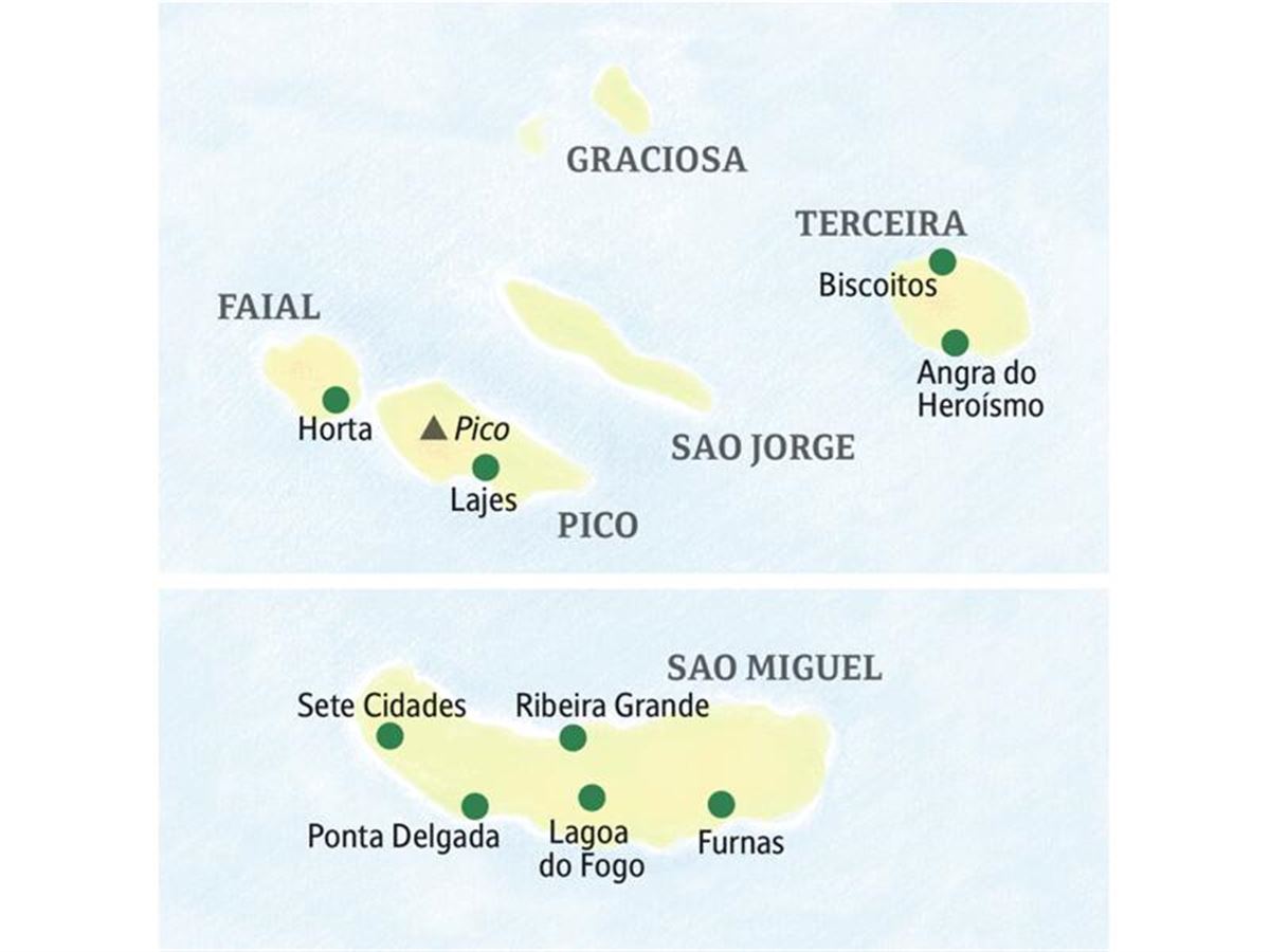 In Faja de Baixo dreht sich alles um die Ananas. Wir inspizieren die uralten Gewächshäuser der Ananas und naschen uns durch die Geschmackspalette von Eis, Küchlein bis Likör und natürlich eine frische, saftige Ananas. Zum Abschied geht es hinauf zum Kraterrand von Sete Cidades: Ein tintenblauer und ein smaragdgrüner See schmiegen sich wie ein Liebespaar aneinander. Alles Legende? Bei gutem Wetter können wir uns selbst davon überzeugen. 60 km. Am Nachmittag bleibt noch genügend Zeit, auf der Suche nach einem Mitbringsel durch die Gassen von Ponta Delgada zu schlendern. Oder vielleicht doch lieber eine der azorischen Köstlichkeiten aus einem der Delikatessengeschäfte? Abends nehmen wir in einem Restaurant kulinarisch Abschied und wissen: Zu Hause erwarten wir das nächste Azorenhoch noch sehnsüchtiger, weil es an die wunderschöne Zeit auf dem Archipel mitten im Atlantik erinnert!