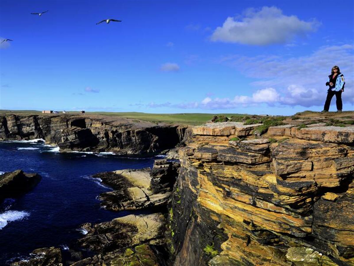 Vormittags werden wir in einer klassischen Brennerei in die Geheimnisse der Whisky-Herstellung eingeweiht. Wer mag, probiert einen "wee dram", einen Malt Whisky. "Slainte mhath!" Dann setzt uns von Thurso aus die Fähre in eineinhalb Stunden nach Stromness über. Unterwegs staunen wir über Klippen, die höher sind als der Berliner Fernsehturm. Auf den Orkneys UNESCO-Welterbe, wohin wir schauen. Die Häuser und Gänge des Steinzeitdorfs Skara Brae liegen halb unter der Erde, der Dünensand hat sie 5000 Jahre lang gut konserviert. Ein Spaziergang an der wildromantischen Küste erdet uns im Hier und Jetzt, lässt uns aber gleichzeitig über den Horizont blicken. Ein ungelöstes Rätsel der Menschheit: der Ring of Brodgar - ein Steinkreis immensen Ausmaßes. Die Geheimnisse dieses Ortes füllen unsere Gespräche in einem typischen Restaurant in Kirkwall am Abend - und unsere Träume während der Übernachtung auf der Fähre nach Lerwick. Busstrecke 80 km.