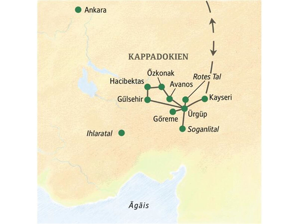 Kappadokien beflügelt die Fantasie: Wo Vulkane einst Lavafeuer und Aschewolken in den Himmel spuckten, haben Wind und Wetter eine Wunderwelt aus Tuffstein geformt. Diese Studiosus-Reise führt mitten hinein ins Märchenland der Feenkamine. Wir entdecken Wohnhöhlen und bemalte Felsenkirchen, erforschen die unterirdische Stadt von Özkonak, spazieren zwischen Riesenpilzen, Mützenbergen und anderen Steinskulpturen, und wer mag wandert durch eine wildromantische Schlucht. Beim Stöbern und Feilschen auf einem lebhaften Markt oder im Gespräch mit einem Klosterwächter sind wir mitten im anatolischen Alltag. Und immer wieder verführt uns die außergewöhnliche Landschaft mit ihren stets neuen Stimmungen zum Träumen.
