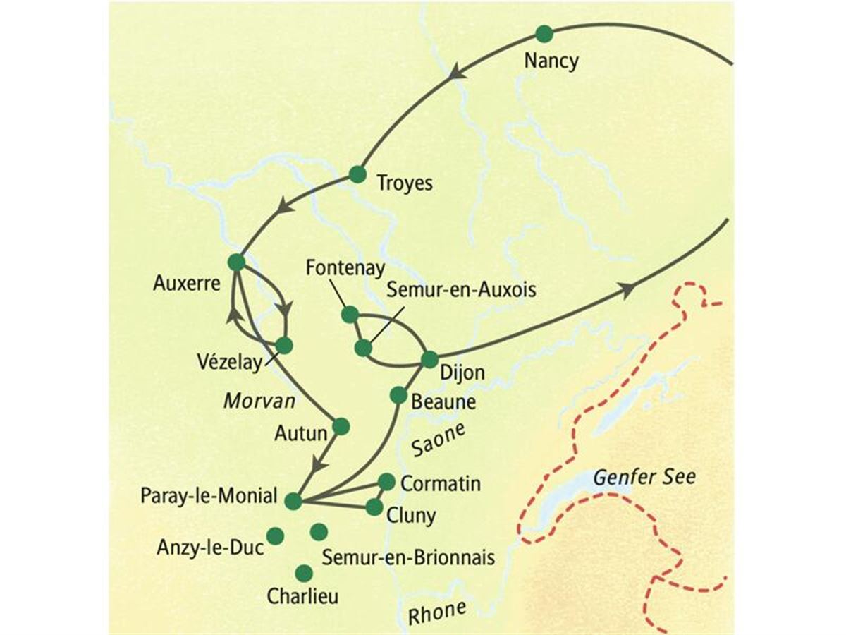 Auf unserem heutigen Ausflug durchs nördliche Burgund begleiten uns sanfte Hügel, Wiesen, Weinberge und kleine Dörfer wie das bildhübsche Semur-en-Auxois. Hier können Sie durch die mittelalterliche Altstadt promenieren und die kleinen Läden durchstöbern. Auch unsere Mittagspause verbringen wir hier. Zum Abschluss dann nochmals ein Kapitel Bilderbuch-Burgund: Versteckt im Wald liegt die Abtei Fontenay (UNESCO-Welterbe) vor uns – ein stiller Platz mönchischer Versenkung, der niemanden unberührt lässt. Zum Abendessen ist in Dijon in einem typischen Restaurant der Tisch für uns gedeckt, und gemeinsam nehmen wir Abschied vom Burgund. 180 km.