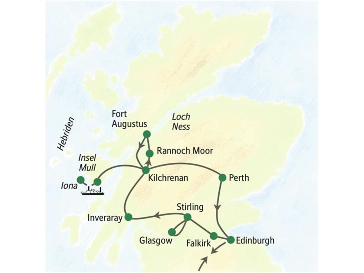 Heute geht es früh los. Eine kurze Fahrt mit der Fähre bringt uns nach Craignure auf Mull. Auf den Hebriden gibt es nur Schafe und Schäfer? Schnell flattert das Klischee in die Lüfte davon: 250 Vogelarten brüten auf der von Menschen nur dünn besiedelten, bergigen Insel. Auf der Nachbarinsel Iona herrscht dann wirklich andächtige Stille. Von hier aus kam das Christentum auf das Festland, aber zurück kam nichts. Kann einen hier eigentlich irgendetwas aus der Ruhe bringen? Eine Inselbewohnerin erzählt uns vom Leben mit dem Meer, auf der Insel und vom Kloster. Selbst Mendelssohn Bartholdy war von der Landschaft musikalisch inspiriert: Mit der Hebriden-Ouvertüre im Ohr fahren wir zurück aufs Festland. Busstrecke 180 km.