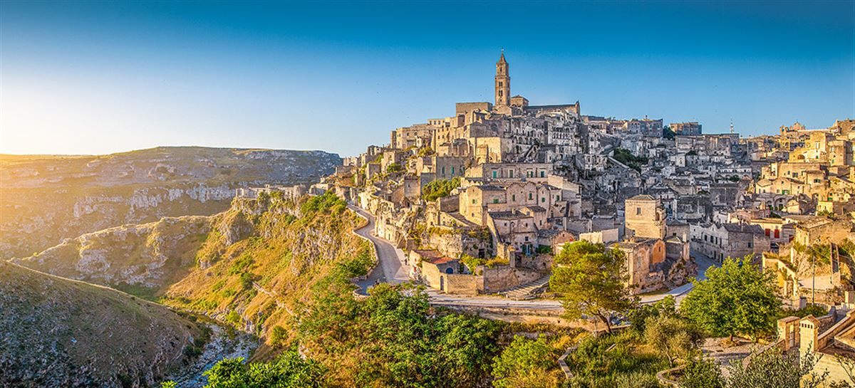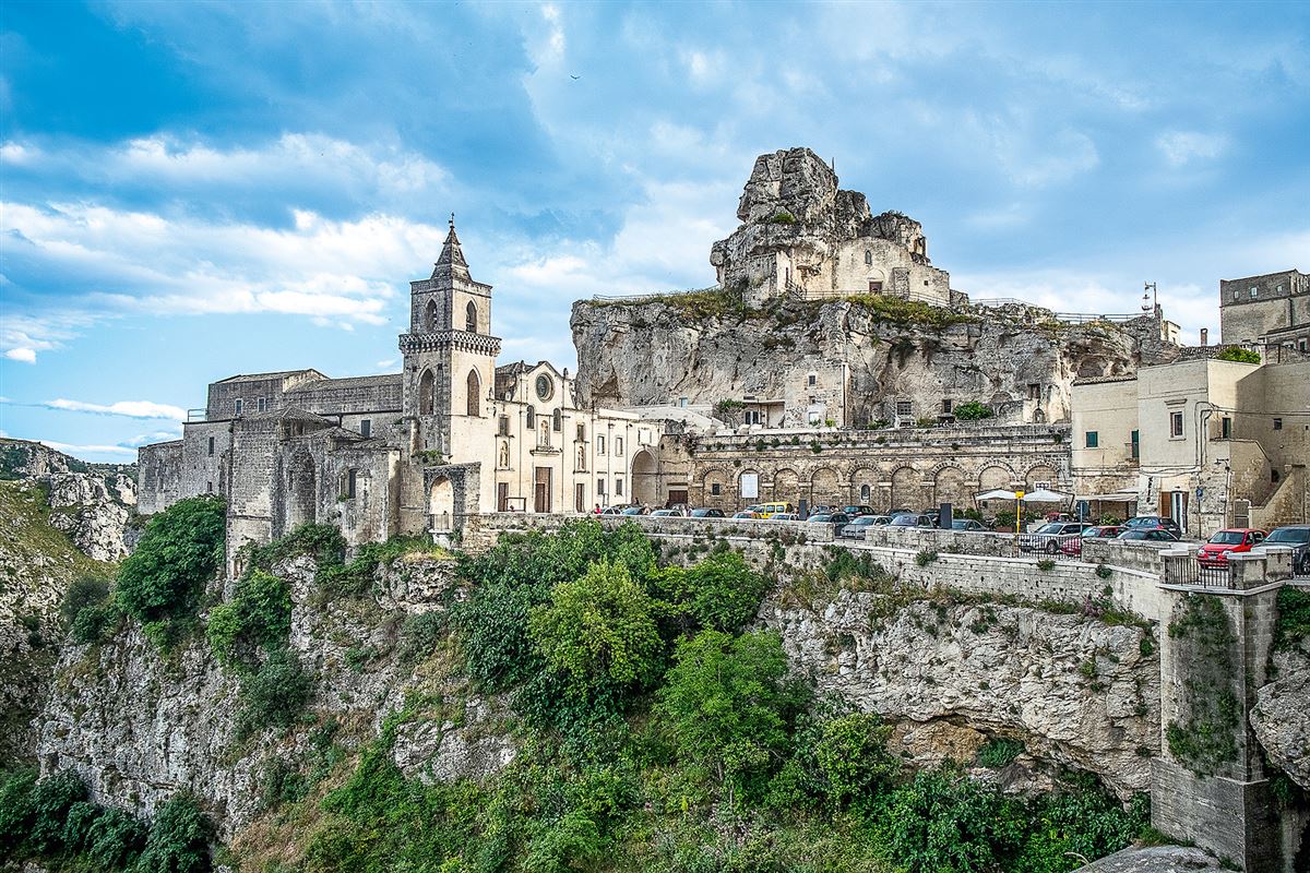 Der Höhepunkt Ihres Aufenthalts in der Basilikata ist zweifellos die Besichtigung von Matera (ca. 30 km), deren Höhlensiedlungen und Felskirchen hoch über einer tiefen Schlucht zum UNESCO-Weltkulturerbe zählen. Die Stadt, auch bekannt als die Höhlenstadt, diente seit den 1950er Jahren als Kulisse für Filme berühmter Regisseure wie Roberto Rossellini und die Gebrüder Taviani. Die Altstadt besteht aus Höhlensiedlungen, die sich in die Felsen schmiegen, und Felsenkirchen, die eindrucksvoll die Geschichte der Stadt erzählen. Bis ins Mittelalter entwickelte sich Matera ausschließlich in diesen Höhlensystemen, bevor auch Kathedralen, Klöster und Häuser außerhalb dieses Systems erbaut wurden. Neben der faszinierenden Architektur beeindrucken auch die Farben und Formen dieser reinen Felsstadt, die zudem mit hervorragenden Weinen und lokalen Spezialitäten aufwartet.