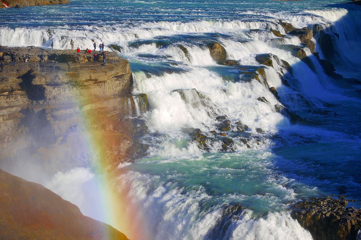 Am Morgen beginnt unsere Rundreise. Wir besuchen den Nationalpark Thingvellir, in dem das isländische Parlament Althing 930 n. Chr. gegründet wurde. Ebenfalls treffen in der UNSECO-Weltkulturerbestätte die amerikanische und eurasische Platte aufeinander. Das Wandeln »zwischen« den beiden Kontinentalplatten ist ein einmaliges Erlebnis! Weiter geht es in das bekannteste Hochtemperaturgebiet Islands, Haukadalur. Hier beeindruckt uns vor allem der Große Geysir, Namensgeber aller Springquellen. Der Geysir Strokkur, das Butterfass, liegt nur wenige Meter daneben. Auf ihn ist Verlass! Alle zehn Minuten schießt das Wasser bis zu 20 Meter hoch. Das letzte Highlight des Tages ist der Gullfoss, der »Goldene Wasserfall«. Er ist der wohl bekannteste Wasserfall Islands. 300 km