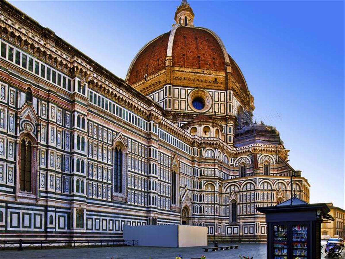 Ein Florentiner Weltwunder und unser erstes Ziel für heute: der Dom mit seiner gigantischen Kuppel. Ihr Reiseleiter wirft mit Ihnen einen Blick auf die geniale Konstruktion und entschlüsselt Ihnen auch die in Bronze gegossenen Bilder an den Türen des Baptisteriums. Passend dazu: Michelangelos David und die anderen Skulpturen auf der Piazza della Signoria - aber auch die Top-Adressen für Eleganz und Stil von Heute, die wir an der Via Tornabuoni entdecken. Die Ponte Vecchio mit ihren Juweliergeschäften haben wir zwar nicht für uns allein - aber die Stimmung am Arno nimmt uns auch inmitten der anderen Kunstpilger gefangen.