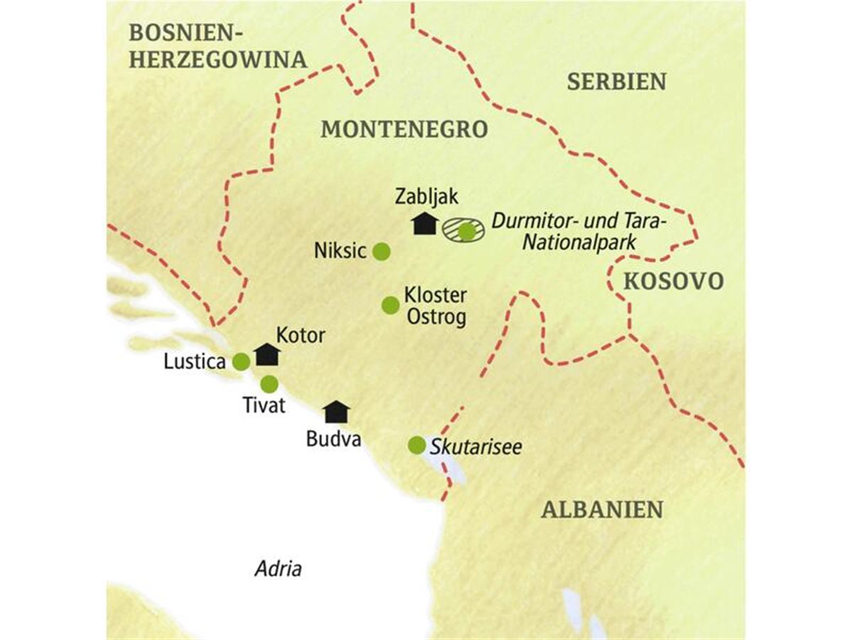 Aussichts- und kurvenreich Richtung Küste: Unterwegs machen wir eine Kaffepause im Dorf Nevidio, umgeben von einer Bilderbuchlandschaft. Dann schlängelt sich unser Bus weiter hinauf zum Kloster Ostrog. In 600 m Höhe ist es direkt in eine Felswand gemauert. Warum Pilger aus aller Welt hier Heilung erbitten, erzählt Ihre Reiseleiterin beim Rundgang. Auf dem Weingut Radevic schmecken wir den Aromen aus edlen Barrique-Tropfen nach: Wildorange? Minze? Dazu gibt's exquisite Häppchen. Weiter zum Skutarisee, dem größten See des Balkans, ein Seerosen- und Vogelparadies. Und schließlich ans Meer: In zentraler Lage in Budva erwartet uns das Hotel Moskva mit 40 Zimmern, Wellnessbereich und Außenpool. Zwei Übernachtungen in Budva.