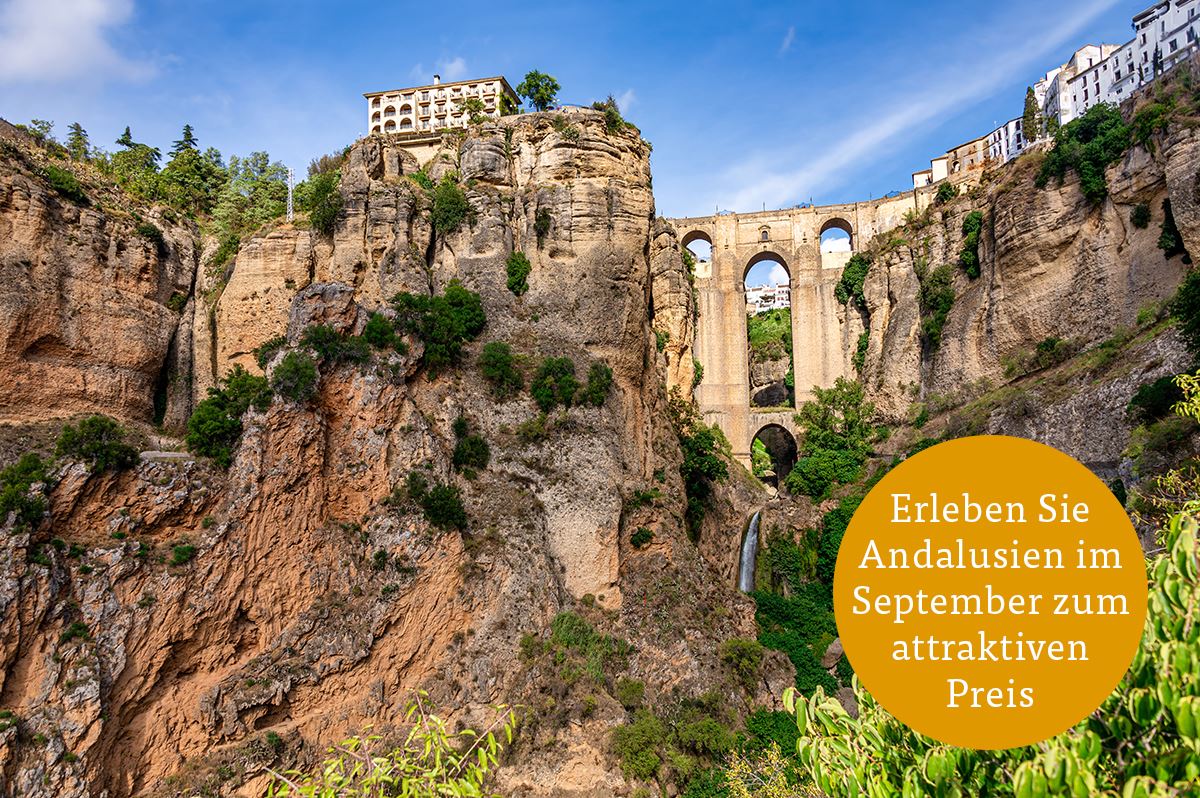 Die Costa del Sol führt uns ins Hinterland, wo wir die Orangenplantage Cortijo del Sol besuchen. Nachdem wir unser Wissen über Zitrusgold und das andalusische Landleben erweitert haben, fahren wir weiter nach Ronda. In Ronda hat sich die Natur etwas Besonderes einfallen lassen. Eine tiefe Schlucht trennt die Neustadt von der pittoresken Altstadt. Klar, dass der Mensch sich gefordert sah und die imposante Brücke"Puente Nuevo" über den Abgrund baute. Wir entdecken die ruhigen Gassen, besuchen einen Adelspalast und stehen unvermittelt vor der Geburtsstätte des modernen Stierkampfs, der Arena von Ronda. Wo sich schon echte Kerle wie Ernest Hemingway am Kampfe erfreuten, lassen wir uns in die Feinheiten des Stierkampfs einführen - ganz unblutig natürlich. Dazu passen auch Gedichte von Rainer Maria Rilke, dessen bronzenes Abbild uns streng entgegenblickt. Im Winter 1912 suchte er hier Linderung seiner Leiden - und die südliche Sonne. Wer mag, findet in einer der Bars in den Gassen bestimmt noch ein Plätzchen, um bei einem Glas Wein den Tag in Ronda ausklingen zu lassen. 105 km