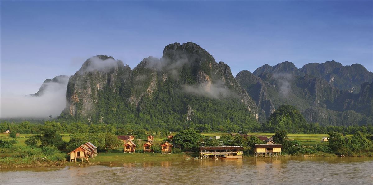 Nach dem Frühstück starten wir unsere Besichtigungstour durch Vientiane. Wir beginnen mit dem Wat Sisaket, dem ältesten erhaltenen Tempel der Stadt, der für seine tausenden kleinen Buddha-Statuen bekannt ist. Ganz in der Nähe liegt Wat Prakeo, einst der königliche Tempel und heute ein Museum für Kunst und Antiquitäten. Ursprünglich wurde er im Jahr 1565 errichtet, um den berühmten Smaragd-Buddha zu beherbergen, der heute in Bangkok verehrt wird. Anschließend fahren wir entlang der Lanexang Avenue zum Patuxai-Monument, dem Triumphbogen von Vientiane, der seinem Pariser Vorbild nachempfunden wurde. Wer möchte, kann die Treppen zur Aussichtsetage erklimmen und den Blick über die Hauptstadt genießen. Ein weiteres Highlight ist das That Luang, die goldene Stupa gilt als das bedeutendste religiöse Bauwerk des Landes und nationales Symbol von Laos. Am Nachmittag verlassen wir Vientiane und fahren über die moderne Schnellstraße nach Vang Vieng, umgeben von eindrucksvoller Karstlandschaft. Nach Ankunft besuchen wir die Jang-Höhle, ein geschichtsträchtiger Ort mit herrlichem Ausblick auf die umliegenden Kalksteinfelsen und den Nam-Song-Fluss. (130 km)