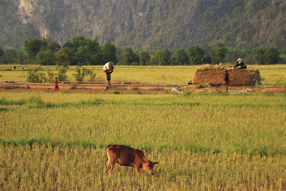 Am Morgen fahren wir zu den idyllisch gelegenen Kuang-Si-Wasserfällen, einem der schönsten Naturziele rund um Luang Prabang. Entlang der Waldpfade wandern wir zu türkisfarbenen Kaskaden, wo sich je nach Wetter auch ein erfrischendes Bad anbietet. Direkt bei den Wasserfällen besuchen wir das Bear Rescue Centre, eine wichtige Auffangstation für gefährdete asiatische Schwarzbären. Auf dem Rückweg nach Luang Prabang halten wir an der Laos Buffalo Dairy, einer sozialen Initiative zur Unterstützung lokaler Bauern durch die Herstellung von Käse und Milchprodukten aus Büffelmilch. Am Nachmittag erreichen wir das Living Land Projekt, eine nachhaltige Farm inmitten malerischer Reisterrassen, umgeben von Bergen. Nach einem landestypischen Mittagessen erhalten wir spannende Einblicke in den traditionellen Reisanbau. Wer möchte, kann selbst mithelfen, vom Pflügen mit dem Wasserbüffel bis zum Pflanzen, Ernten und Verarbeiten der Reiskörner. Alternativ lässt sich das Geschehen entspannt von der Terrasse des traditionellen Bauernhauses aus beobachten. Ein lehrreicher und unterhaltsamer Ausflug, der nicht nur das Thema Reis, sondern auch den Alltag im laotischen Landleben näherbringt: ökologisch, respektvoll und authentisch.