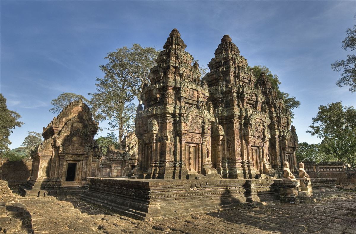 Zu den kleinsten Tempeln in der kambodschanischen Region Angkor gehört der faszinierende Banteay Srei. Doch seine geringe Größe macht der prächtige Tempel mit seiner herrlichen Ornamentik wieder wett, denn diese macht den Banteay Srei zu einem der kunstvollsten Tempel innerhalb Angkors. Gerade einmal 30 Kilometer nordöstlich des berühmten Angkor Wat, lag dieser kleine Tempel Jahrhunderte lang versteckt in den Tiefen des kambodschanischen Dschungels. Erst im Jahre 1914 entdeckten französische Archäologen den Tempel wieder. Zu dieser Zeit war Banteay Srei, dessen ursprünglicher Name Tribhuvanamahesvara, zu Deutsch „Großer Gott der dreifaltigen Welt“, lautet, allerdings fast vollständig zerfallen. Deshalb begannen französische Experten 1931 damit in aufwendiger Kleinarbeit mit dem Wiederaufbau der imposanten Tempelanlage.