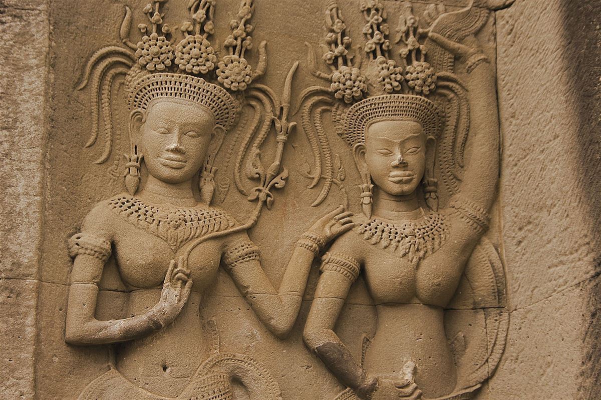 Die Architektur von Angkor Wat ist ein Meisterwerk der Khmer-Kultur. Die gesamte Tempelanlage wurde aus kunstvoll bearbeitetem Sandstein errichtet. Über ein ausgeklügeltes System von Kanälen wurden die Steine per Floß transportiert und so präzise geschliffen, dass sie nahtlos aufeinandergesetzt werden konnten. Das Areal umfasst einschließlich des Wassergrabens eine Länge von 1,5 Kilometern und eine Breite von 1,3 Kilometern. Der zentrale Tempel, der von fünf turmförmigen Erhebungen in Form von Lotosblüten dominiert wird, symbolisiert den heiligen Berg Meru – das Zentrum des Universums in der hinduistischen Mythologie. Aufwendige Reliefs und kunstvolle Schnitzereien zeigen Szenen aus dem Ramayana und Mahabharata sowie detailreiche Darstellungen von Tänzerinnen, sogenannten Apsaras.