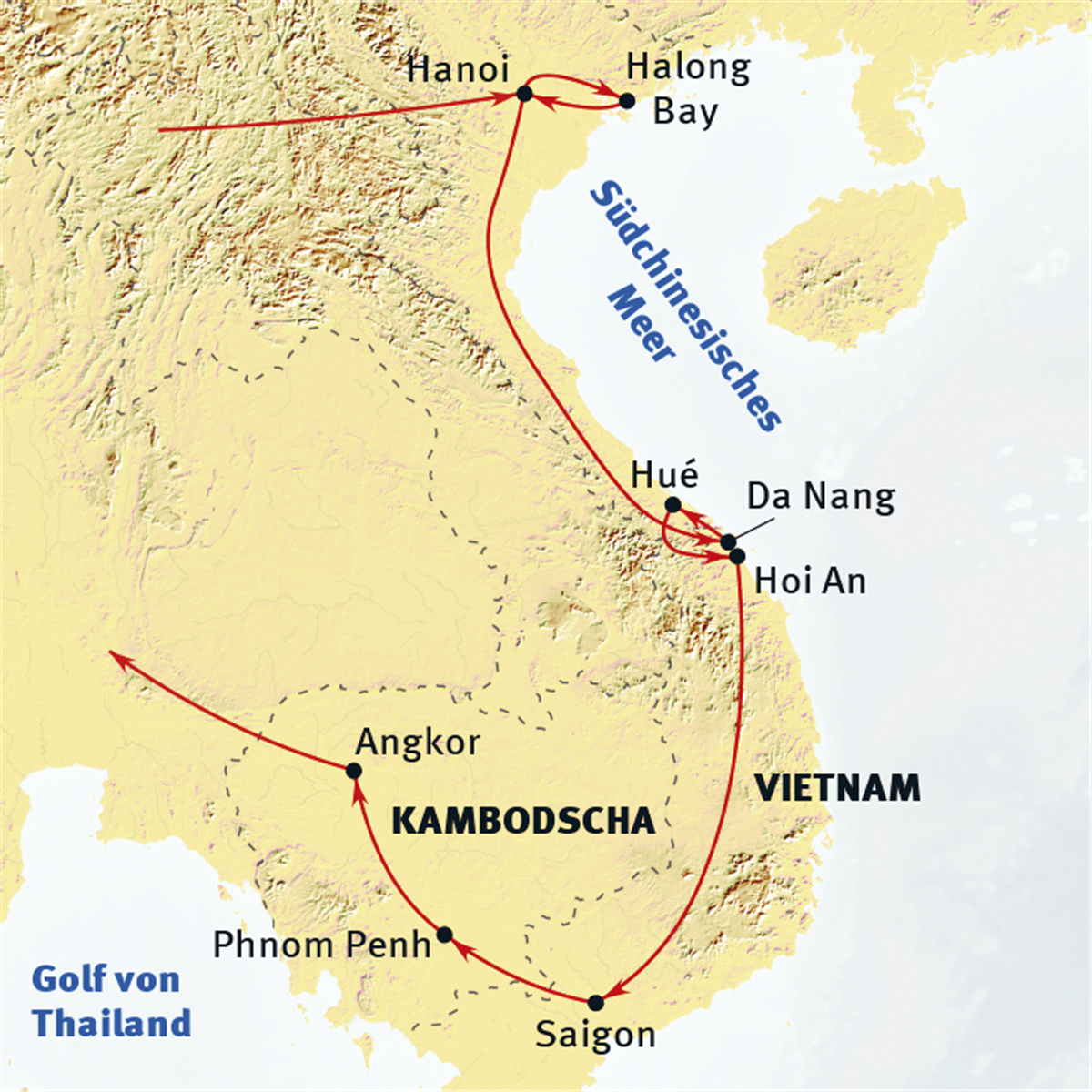 Diese 15-tägige Rundreise durch Vietnam und Kambodscha vereint Kultur, Natur und authentische Begegnungen in einem ausgewogenen Tempo. Von Hanois quirligen Straßen über die Halong-Bucht, kaiserliches Hué und das historische Hoi An bis zum tropischen Süden mit Saigon und Mekong-Delta erleben Sie Vietnams Vielfalt. In Kambodscha erkunden Sie Phnom Penh und die Tempel von Angkor, besuchen ländliche Dörfer und erleben lokale Traditionen hautnah.