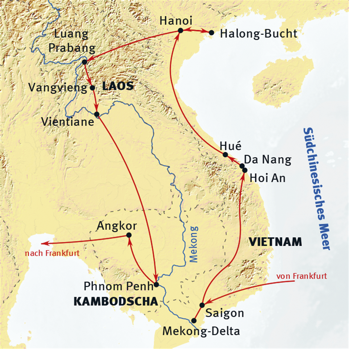 Ho Chi Minh StadtDanangHoi AnHueHanoiLuang PrabangVang ViengVientianePhnom PenhSiem Reap
