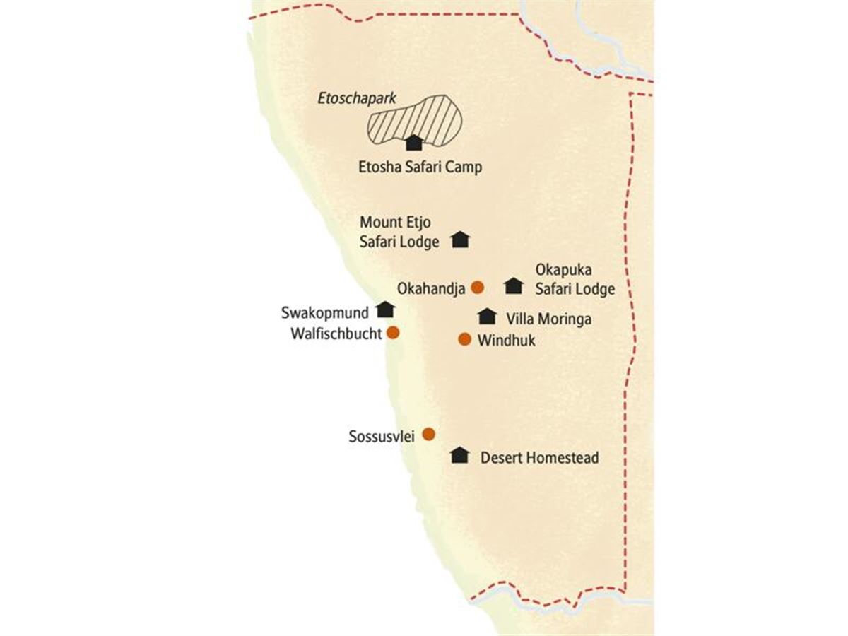 Wer die Namib bereisen möchte, sollte die Trockenzeit zwischen Mai und Oktober wählen – sie bietet ideales Wetter, klare Sicht und angenehme Temperaturen. Früh aufstehen lohnt sich, besonders für den Sonnenaufgang auf Düne 45 oder für einen Spaziergang durch den Sesriem-Canyon. Auch ein Abstecher an die Atlantikküste, nach Swakopmund oder Walvis Bay, bringt Abwechslung – hier treffen Dünen auf Meer und Seelöwen auf Flamingos. Wichtig ist die richtige Vorbereitung: helle, leichte Kleidung, festes Schuhwerk, Sonnenhut und Sonnencreme sind ein Muss. Pro Tag sollte man mindestens 3 bis 4 Liter Wasser dabeihaben – die Trockenheit ist nicht zu unterschätzen. Ein Geländewagen mit Allradantrieb ist für viele Strecken unerlässlich, denn die Pisten sind oft sandig und unbefestigt. Unterkünfte reichen von einfachen Zeltcamps bis zu exklusiven Lodges – frühzeitiges Buchen ist besonders in der Hochsaison ratsam.