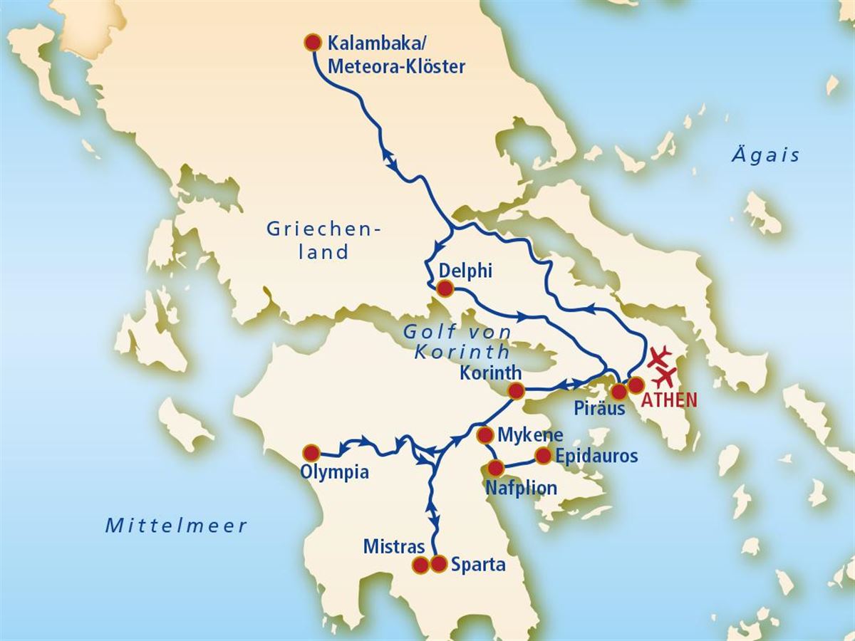 Nach dem Frühstück besichtigen wir die Ausgrabungen von Alt-Korinth: Die handelsstrategisch günstige Lage am Golf von Korinth machte Korinth bereits in klassischer Zeit zu einem der mächtigsten Stadtstaaten Griechenlands. Korinthisches Geld und korinthische Gewichtsstandards waren weit über den Herrschaftsbereich der Stadt hinaus verbreitet. Korinthische Keramik, Waffen, aber auch Luxusartikel wie Parfüm wurden im gesamten Mittelmeerraum verkauft. Darüber hinaus war Korinth die Stadt der Kultur und Kunst, in der nicht nur exzellentes Handwerk gefördert wurde, sondern auch innovative Literatur und Musik ihr Publikum fanden. Was man heute auf dem Ruinengelände sieht, stammt im Wesentlichen aus der römischen Kaiserzeit und der Spätantike. Nur die teilweise aus dem Fels gehauenen Theater- und Brunnenbauten gehen auf die griechische Epoche der Stadt zurück. Wir sehen u.a. die Glauke-Quelle, die Reste des monumentalen Apollotempels, die Agora und das Orakelheiligtum. Einen großartigen Eindruck von der Pracht der kaiserzeitlichen Stadt vermittelt noch heute die vom Marktplatz zum Hafen Lechaion führende marmorgepflasterte, von Säulengängen flankierte Straße. Hier befindet sich auch die größte Sehenswürdigkeit Altkorinths, der Peirene-Brunnen: Der von Herodes Atticus finanzierte repräsentative Gebäudekomplex ist ein vorzügliches Beispiel hadrianischer Baukunst. Die jetzt sichtbaren Wände aus Kalkquadern waren mit farbigen Marmorplatten verkleidet, die Fußböden mit Mosaiken geschmückt. Auf dem Rückweg nach Athen machen wir einen kurzen Abstecher zum Hafen von Piräus. Hotel in Athen.