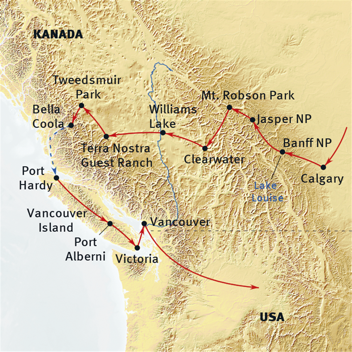 Auf der legendären „Freedom Route“ überqueren wir den mächtigen Fraser River, der sich hier tief durch herrliche Canyonlandschaften schlängelt. Vorbei an Reservaten der First Nations erreichen wir das Chilcotin-Hochplateau und damit eine der entlegensten und ursprünglichsten Gegenden Westkanadas. Für einige Tage wird die herrlich in den Coast Mountains gelegene Guest Ranch unserer Gruppe als Basis für Exkursionen in die umliegende Bergwelt dienen. Die Ranch liegt herrlich am See und bietet Möglichkeiten für Kanutouren und Wanderungen sowie Reitausflüge (fakultativ, ca. CAD 65,- für 2 Stunden) in die Umgebung. Von der Ranch aus hat man bei gutem Wetter einen wunderbaren Blick auf die Bergmassive um den Mount Waddington. Diese einzigartige Bergwelt war Drehort zahlreicher Hollywood Filme (“Der Bär” von Walt Disney, „Sieben Jahre in Tibet“, „K2“ und viele andere Filmklassiker). Tweedsmuir Air bietet Rundflüge zu den Gletschern und Eisfeldern in der überwältigenden Bergwelt der Coast Mountains an, die bei gutem Wetter ein spektakuläres Erlebnis bieten (fakultativ). Während der Tage auf der Ranch 3 x Frühstück, 2 x Mittagessen und 3 x Abendessen inkludiert. 3 Übernachtungen im Haupthaus bzw. in einer Blockhütte. (Gehzeit 2-4 Stunden/ bis 300 Höhenmeter)