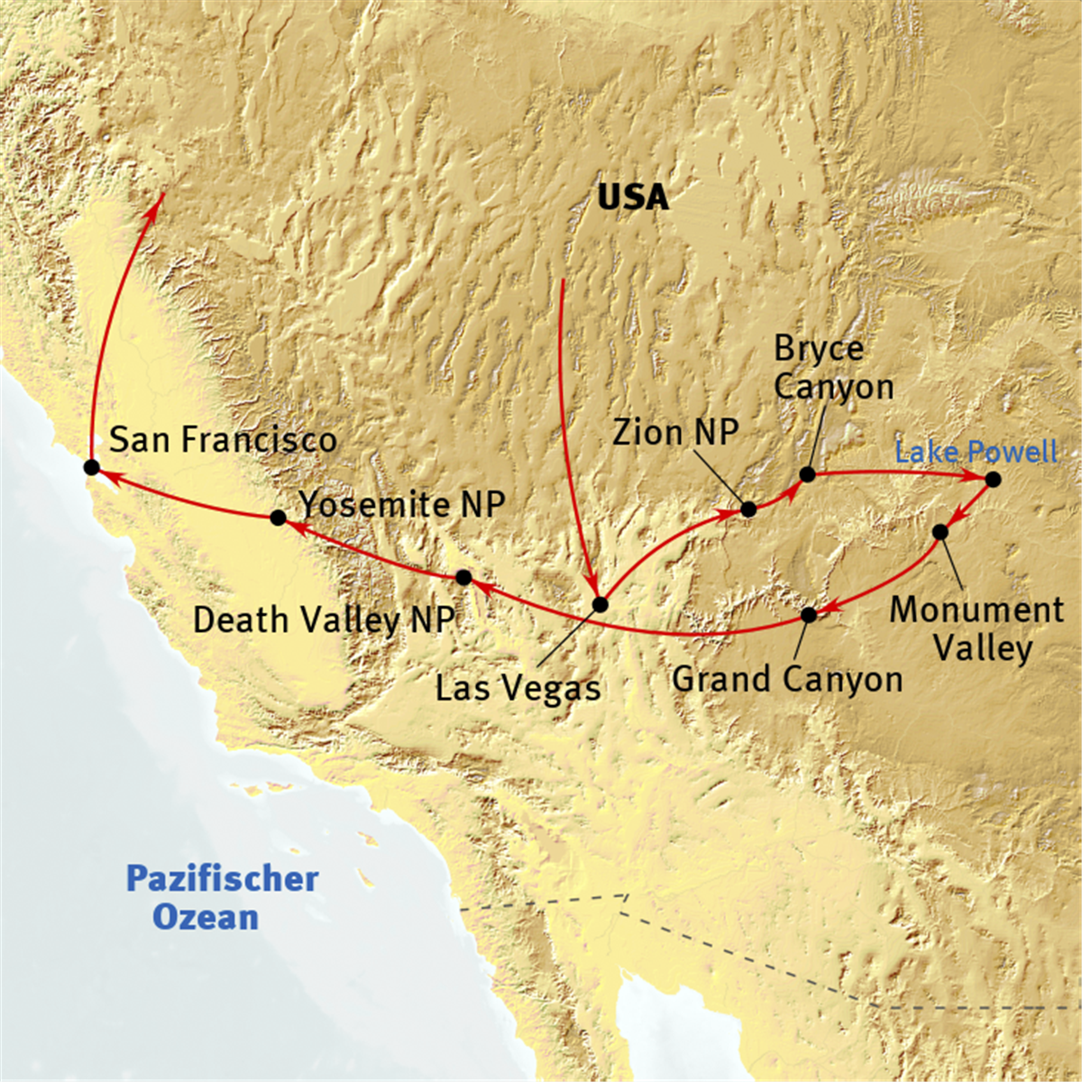 Frühe Fahrt zum Lake Powell. Der See ist durch den Staudamm des Colorado Rivers entstanden. Das tiefblaue Wasser spiegelt schroffe, dunkelrote Felstürme: ein staunenswertes Farbspiel, das unvergessliche Eindrücke hinterlässt. Wir empfehlen eine Jeep-Tour zum Antelope Canyon, „dem klassischen Slot Canyon“ (ca. $100) oder eine Wanderung zum Horseshoe Bend.Quality Inn Page 3* (oder vgl.), Fahrt: ca. 240 km – 3 Stunden.