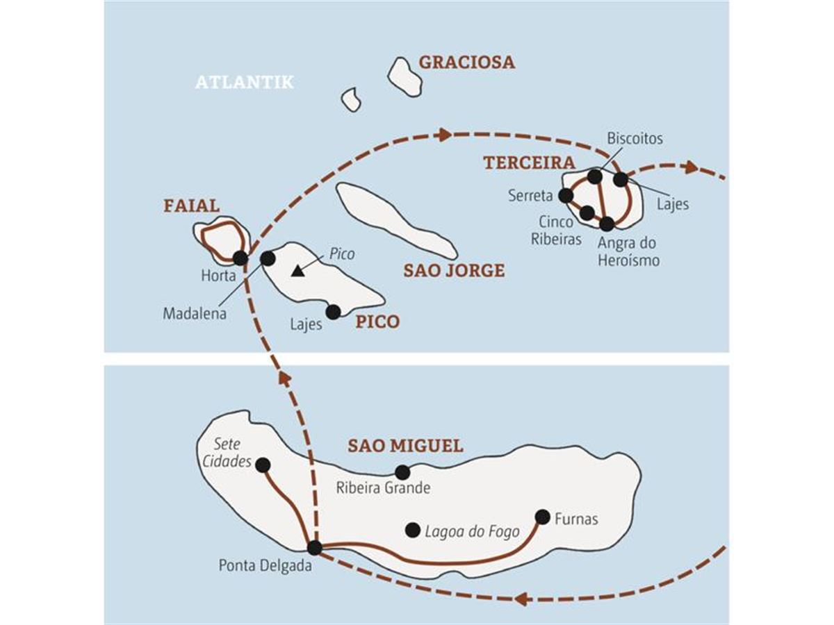 Auf zum Kraterrand von Sete Cidades im Westen der Insel. Ein Selfie am Aussichtspunkt Vista do Rei mit den blau und grün leuchtenden Kraterseen im Hintergrund ist Pflicht. In Faja de Baixo wachsen die saftigen Azoren-Ananas. Wir besuchen eine der Plantagen und probieren selbst unser Geschick beim Anbau. Am Nachmittag erkunden wir Ponta Delgada. Beim gemeinsamen Abendessen genießen wir die typische Inselküche. Dazu vielleicht ein Especial – das lokale Bier? À sua saúde!