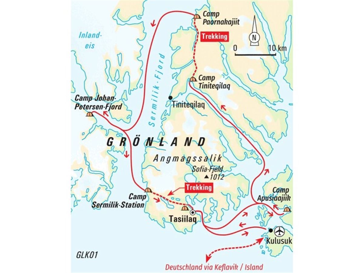 Flug nach Keflavik in Island. Von Keflavik fliegen wir weiter über das Polarmeer nach Kulusuk in Ostgrönland. Es lohnt sich, vor der Landung aus dem Fenster zu schauen und die treibenden Eisschollen aus der Luft zu verfolgen - wir sind in der Arktis! Das kurze Wegstück vom Flughafen zum Hafen legen wir mit unserem Gepäck zu Fuß zurück (ca. 750 m) und fahren dann mit dem Boot weiter auf die Insel Ammassalik (ca. 1 - 2 Std. je nach Eissituation). Während unser kleines Boot an den mächtigen Eisbergen vorbei und zwischen den Eisschollen hindurch fährt, spüren wir die Arktis hautnah - gut, dass wir für die Überfahrt mit warmer Kleidung, Handschuhen und Mütze gerüstet sind, die wir vor dem Ablegen noch anziehen können! Wir erreichen schließlich Tasiilaq, unser Basislager für die kommenden Tage, schlagen unsere Zelte auf und machen uns mit der Umgebung vertraut. Zum Abschluss des Tages versammeln wir uns in unserem Küchenzelt und genießen das warme Abendessen - per Catering vom Roten Haus.