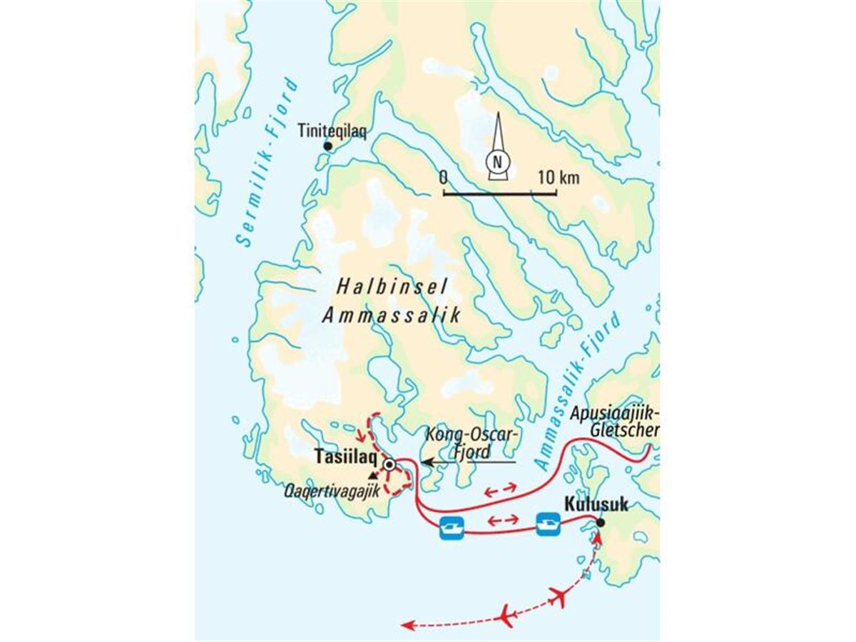Sonnenaufgang! Auch wenn die Sonne nicht wirklich untergeht, ist das Morgenerwachen deutlich spürbar. Das Licht weckt uns in den Zelten und wir lassen bei einem heißen Kaffee die friedliche Stimmung auf uns wirken. Frühstück am Gletscher - kein alltägliches Erlebnis! Nachdem wir unser Camp abgebaut haben, bleibt vielleicht noch Zeit für einen kleinen Spaziergang am Wasser, bevor uns die Inuit wieder mit ihren Booten abholen. Auf der Fahrt halten wir Ausschau nach den Giganten des Meeres - wenn sich nicht zu viel Eis vor der Küste staut, haben wir vielleicht die Chance Buckelwale zu sehen. Wir laufen wieder in Tasiilaq ein und lassen den Tag gemütlich ausklingen. Ein Besuch im Dorf, ein Bummel zum Hafen oder auch ein Streifzug durch den grönländischen Supermarkt - es gibt viele Möglichkeiten.