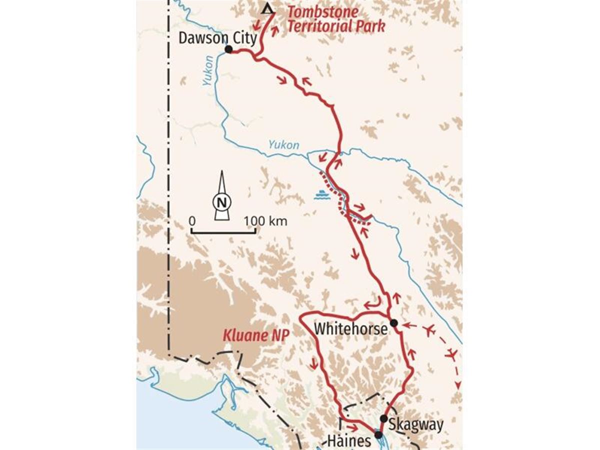 Morgens erreichen wir "Minto Landing", eine in der Nähe gelegene Mine, in der heute immer noch Gold abgebaut wird. Hier verabschieden wir uns von den Kanus. Auf der Fahrt Richtung Norden erinnern unterwegs alte Cabins und Relikte immer wieder an die "Gold Rush Zeit". Als zentraler Ort des Goldrausches bietet Dawson City auch heute noch beinahe unverändert dieselbe Kulisse und zahlreiche Sehenswürdigkeiten. Hier kommt jeder auf seine Kosten: eine Fahrt mit dem Raddampfer auf dem Yukon, der Besuch einer noch aktiven Goldmine, oder einfach auf den alten hölzernen Gehwegen die Main Street entlang schlendern, um das historische Städtchen zu erkunden. Der damalige Goldrausch ist schon über hundert Jahre her, jedoch fühlt es sich hier beinahe so an, als wäre es gestern gewesen.