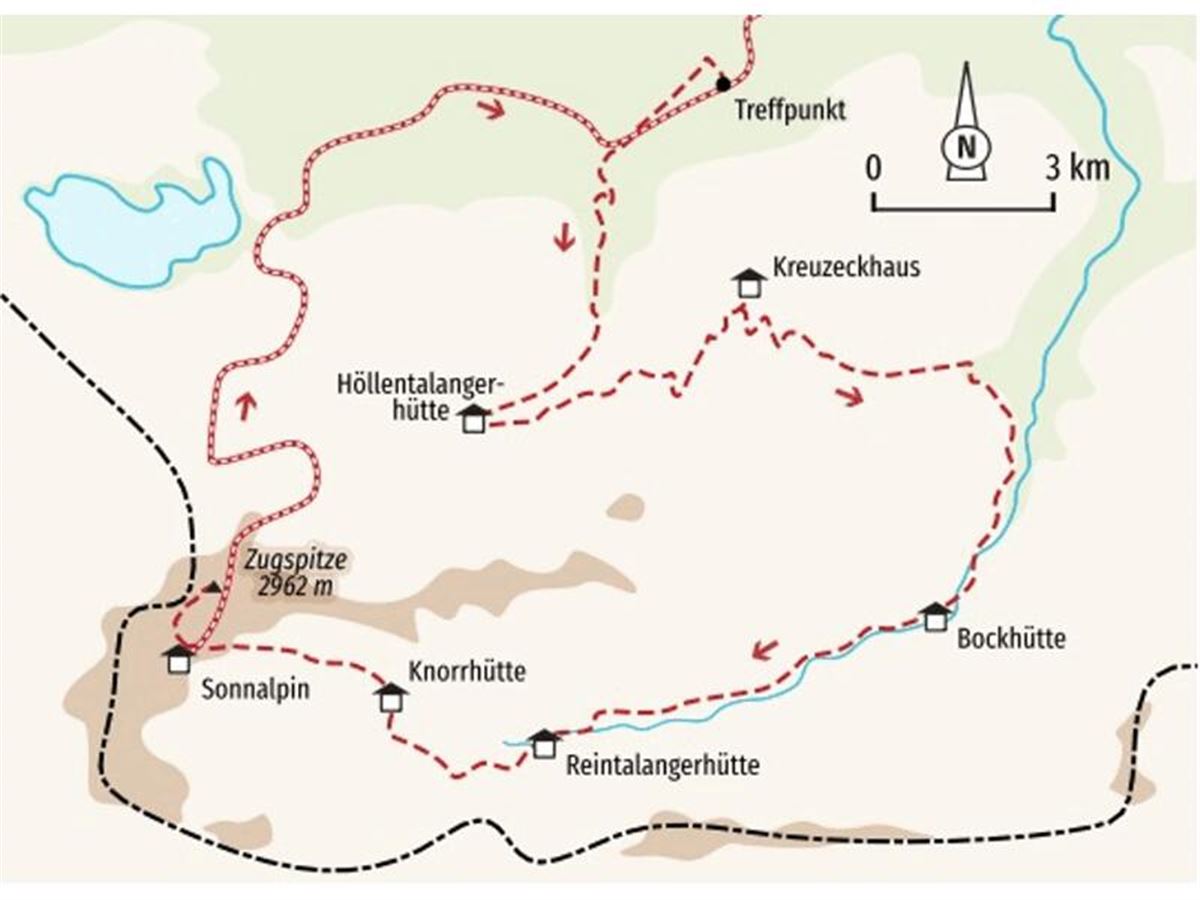 Wir beginnen unser Wochenende an der Talstation der Alpspitzbahnen in Garmisch-Partenkirchen. Nach einer Begrüßung und kurzen Einführung durch unsere(n) Bergwanderführer(in) wandern wir gemeinsam nach Hammersbach und durchqueren die wild tosende Höllentalklamm. Nachdem wir über Stege und entlang steiler Felswände dieses Naturschauspiel hinter uns gelassen haben, erreichen wir für unsere Mittagspause die Höllentalangerhütte. Gut gestärkt geht es auf dem alten Minenweg weiter zu den Knappenhäusern und über das Hupfleitenjoch und den Längenfelderkopf zum Kreuzeckhaus, unserem Nachtquartier für die heutige Etappe.