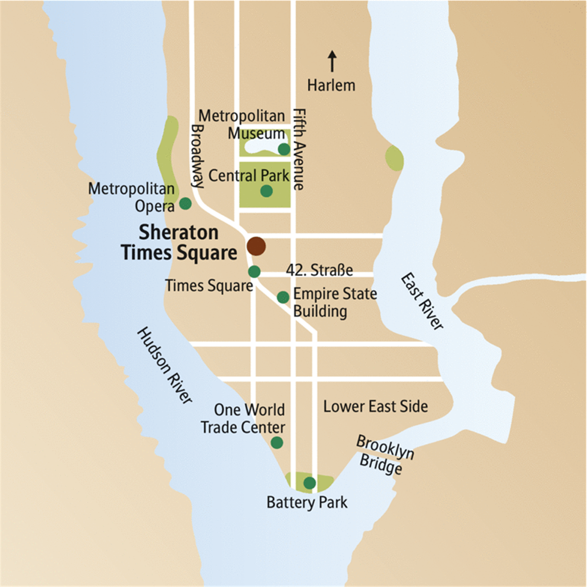 Die Metro bringt uns nach Lower Manhattan. Wir ziehen zu Fuß zum One World Trade Center am Ground Zero. Kleine "Kursschwankung" zur Wall Street, dann schauen wir vom Battery Park zur Freiheitsstatue hinüber. Nach der Mittagspause wechseln wir Verkehrsmittel und Perspektive: Die Fähre auf dem East River zeigt uns neue Seiten der Stadt. Wir beginnen unsere Runde durch das trendige und alternative East Village in einem Community Garden: Wir plaudern mit den Hobby-Gärtnern über die Bedeutung der Grünanlagen im Betongrau. Zurück zum Hotel geht es mit der Subway. Der Abend gehört Ihnen. Die besten Adressen, um die kulinarische Vielfalt New Yorks zu erkunden, kennt Ihre Reiseleiterin!
