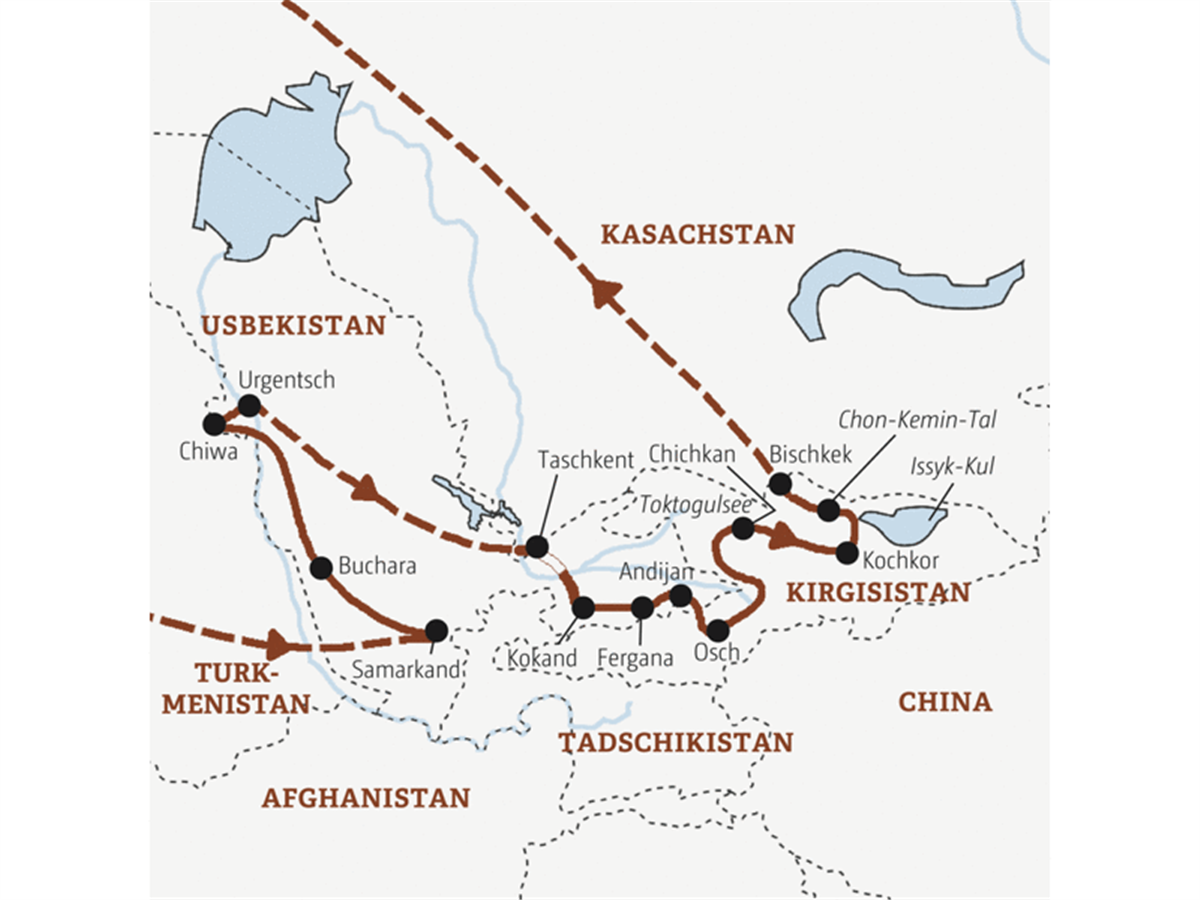 BucharaSamarkandChiwaUrganchTaschkentBishkekFerganaKokandKochkorOsch