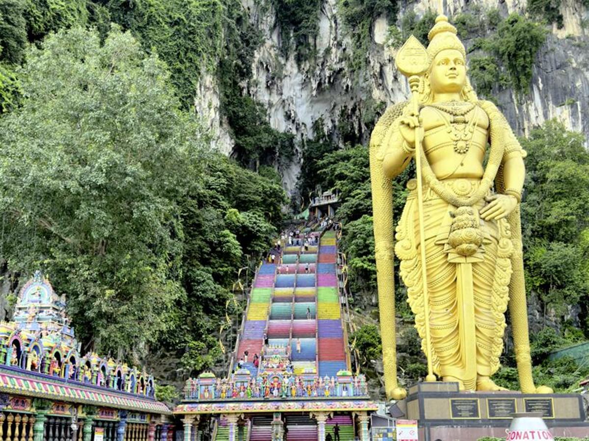 Stadtrundfahrt in "KL", Malaysias kosmopolitischer Metropole. Wir stoppen an der Nationalmoschee Masjid Negara, besuchen einen chinesischen Tempel und den Kricketplatz aus britischer Kolonialzeit. Staunend schauen wir dann hinauf zum Merdeka PNB 118 Tower, dem mit 678 m zweithöchsten Gebäude der Welt. Weiter zu den Batu-Höhlen, die sich nördlich von Kuala Lumpur in den Kalkstein graben. Bewacht von der 42 m hohen goldenen Statue des Hindugottes Murugan führen 272 Stufen bis zum Schrein von Gott Subramaniam – für malaysische Hindus ein Pilgerziel, für alle ein Natur- und Kulturhingucker. Am Abend noch Lust, einen Spaziergang im KLCC-Park am Fuß der Petronas-Türme zu unternehmen?