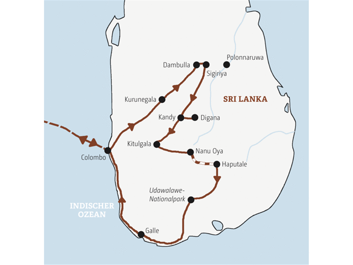 Mit unserer Mini-Gruppe tauchen wir tief ein ins Leben des Inselstaats: Kochen mit Ayesha, Gespräche mit einem Mönch im Felsentempel. Wir statten Babyelefanten einen Besuch in ihrem Zuhause ab und schlagen unser Bett mitten in der Wildnis auf. Per Zug, Tuk-Tuk und Boot sind wir fast privat unterwegs. Und zum Finale unserer Rundreise durch Sri Lanka: Genusstage am Strand.
